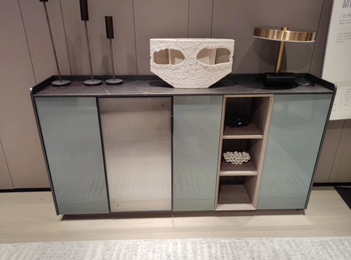 一侧的落地陈列柜则是采用了很简易的青苔绿玻璃材质门板搭配水墨灰岩板台面,再加上其上的艺术装饰品的点缀,在完成空间补充收纳的基础功能之外,也极大地增高了书房空间的艺术气息以及文化底蕴。