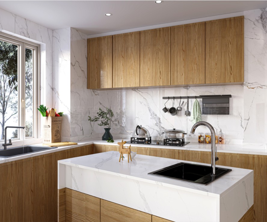 地面用砖:SMC682TS9539高山棕烁规格:800x2600mm墙面用砖:SHA573AF1500卡斯特-浅黄规格:750x1500mm墙面搭配肌肤面新品--卡斯特。介于黄白之间的浅黄,很好地中和了大理石的冰冷,表面30°左右光感以及婴儿肌肤般的触感,当阳光透过窗户照进室内,形成舒适的漫反射效果,为家居营造温馨的氛围。PART 2 :厨房Kitchen