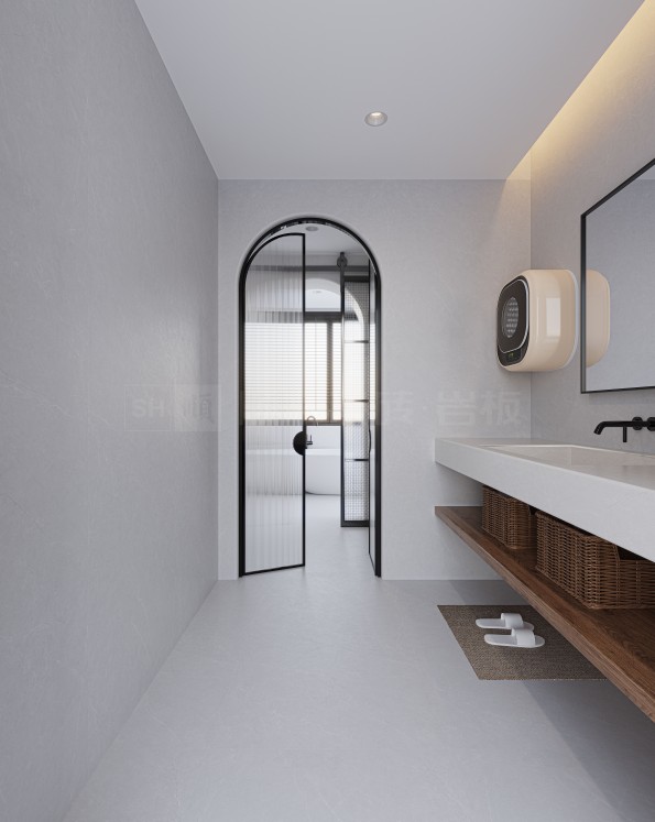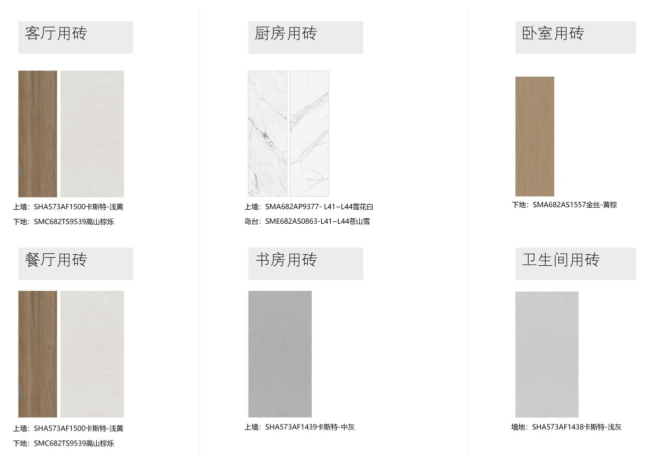 墙地用砖:SHA573AF1438卡斯特-浅灰规格:750x1500mm卫生间选用卡斯特-浅灰进行墙地大面积应用,无过多装饰的浅灰色带有些许高冷,但柔和的表面宛如覆上了一层柔焦滤镜,加上木纹隔板和编织篮的点缀,空间温度瞬间回升。本方案选用产品一览List of selected products