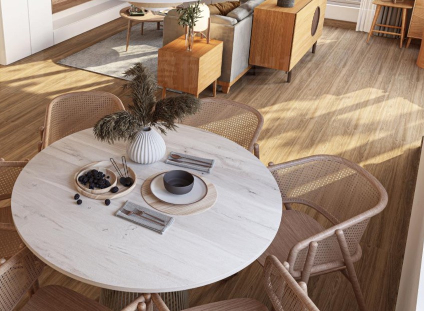 地面用砖:SMC682TS9539高山棕烁规格:800x2600mm进入室内,用高山棕烁木纹岩板进行地面通铺,精雕工艺有效防滑耐磨,特别适合公共区域使用。触手可碰的原生木纹细节,温润而抚慰人心,自然旷野的感觉从客厅、餐厅一路延伸到房间过道。木质家具、布艺沙发和绿植的加入,为空间点睛。再通过一些出彩软装的点缀,比如棕黄色的抱枕、千鸟格的抱枕,都能让空间层次更丰富,现代感也更强烈。Dining room