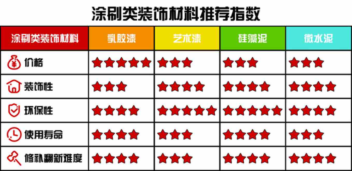 市面上常见涂刷类装饰材料包含:乳胶漆、艺术漆、硅藻泥、微水泥等;