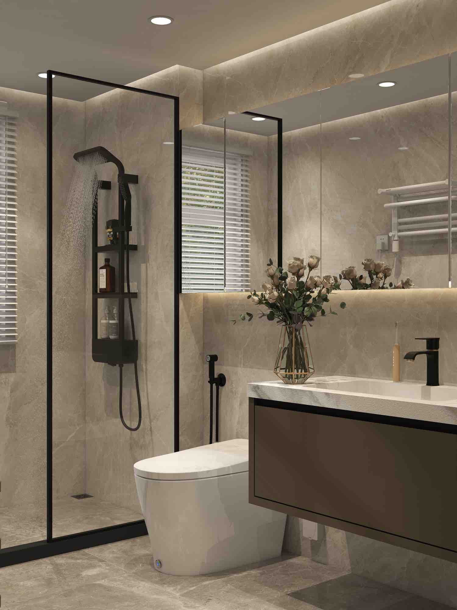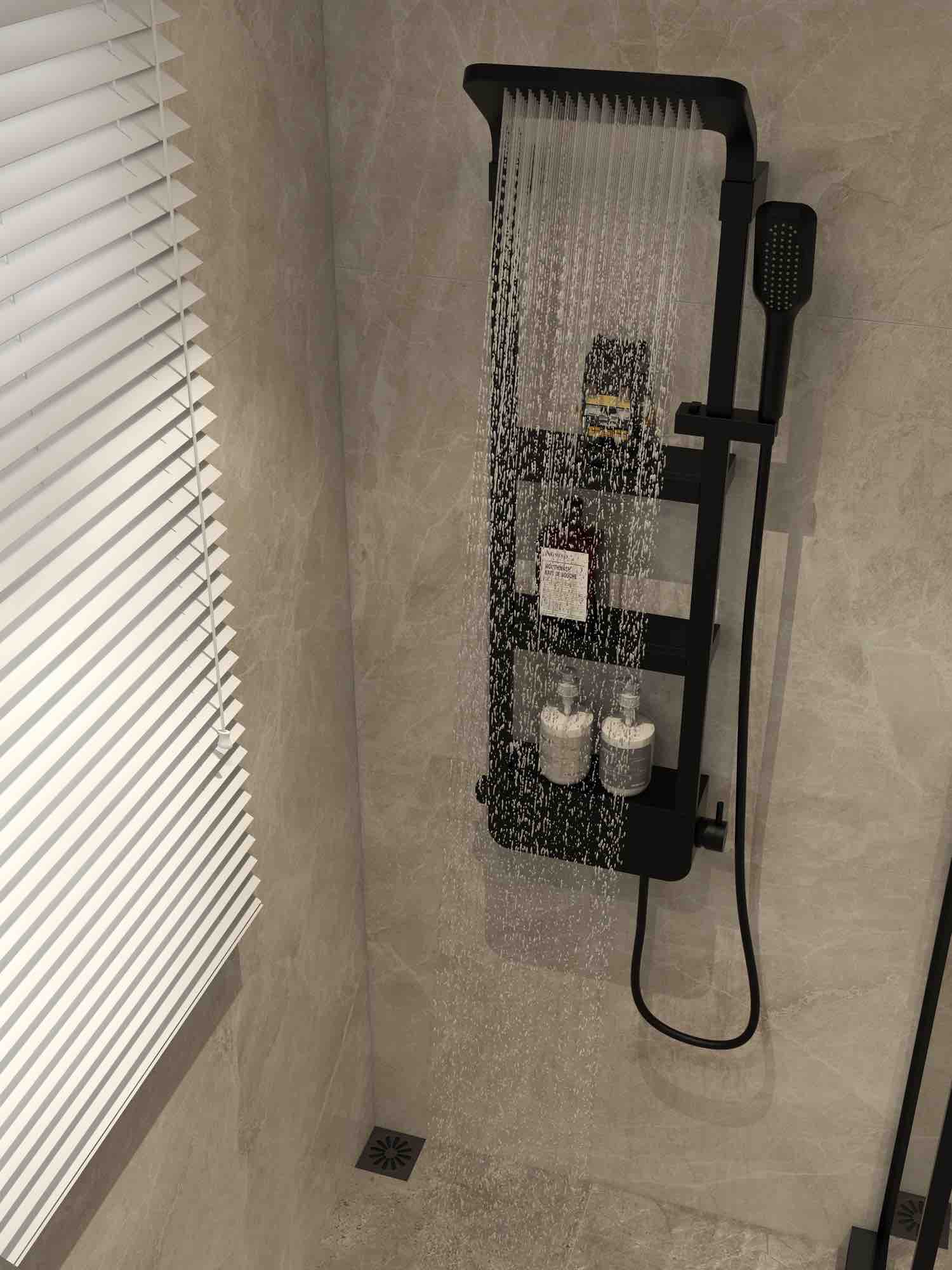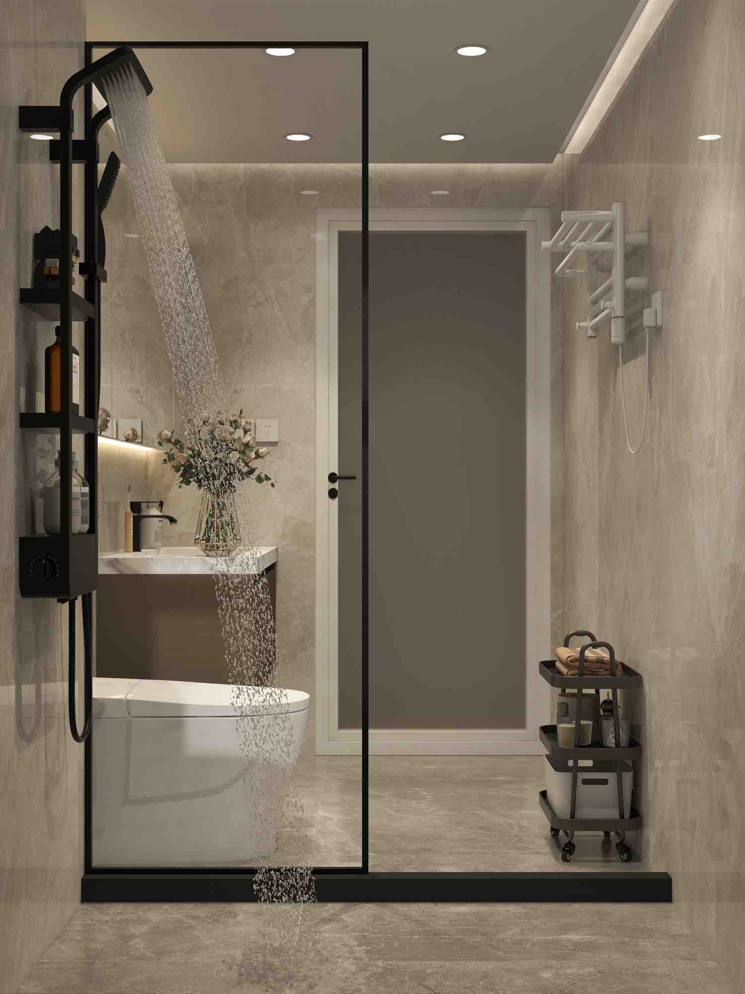 简简单单的装修,黑色花洒和灰色浴室太配了! 简简单单的灰色