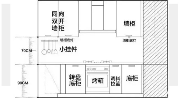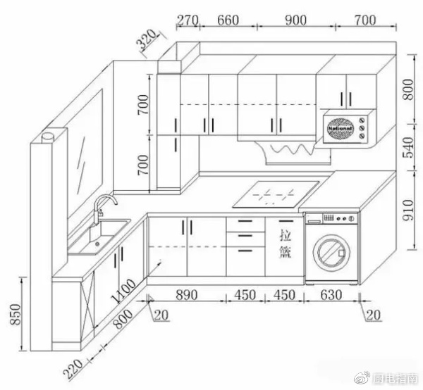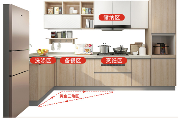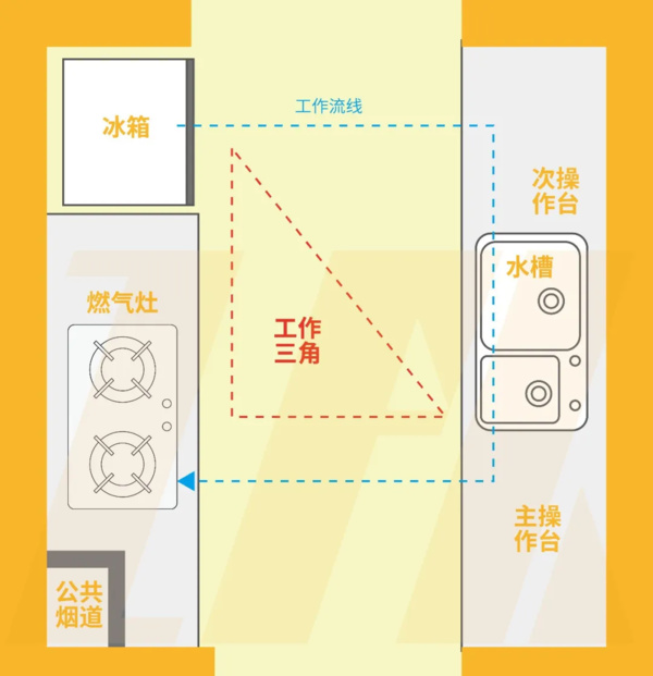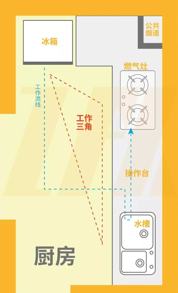 添加链接请输入图片描述(最多50字)01厨房动线很多中式厨房从未考虑过布局动线问题:炉灶旁边就是洗菜区,缺少备菜的台面等等,导致做饭的时候手忙脚乱,效率低下。厨房的基本动线是:洗菜(水槽)→切菜(台面)→炒菜(炉灶)