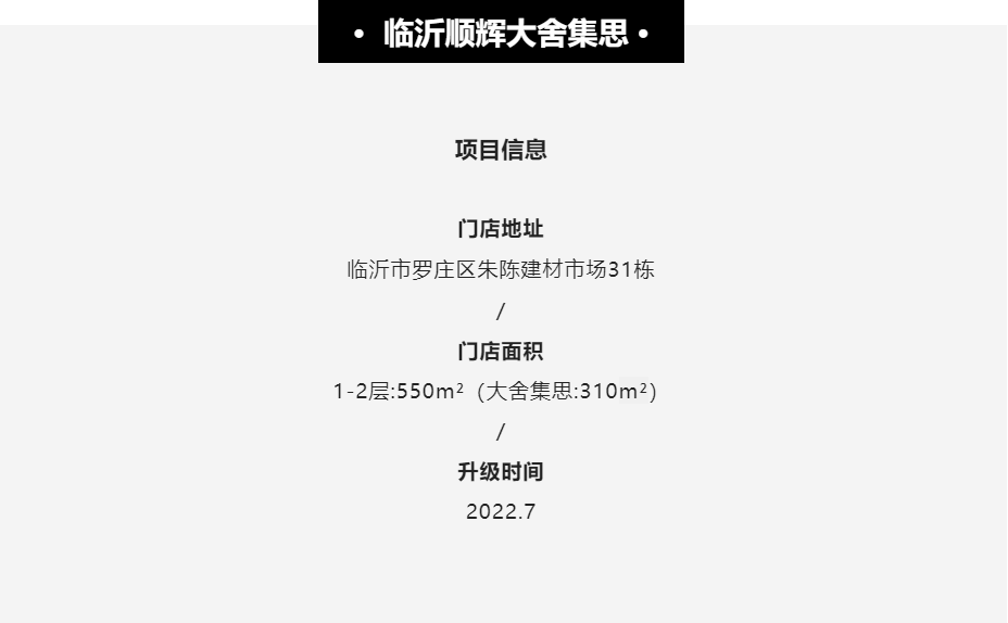 焕新改造打造区域门店标杆临沂顺辉大舍集思位于临沂高端品牌集聚的建材市场中,独栋展厅上下2层的极大空间让门店设计师有更多的创作空间。“过去的装修风格是以雍雍华贵、暖黄色调为主的,近年来年轻消费者则追求从繁到简,颜色越统一越好,花纹越简单越好,产品和门店形象的更新换代也就迫在眉睫了。”宋总对市场变化如此说道。