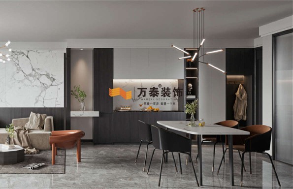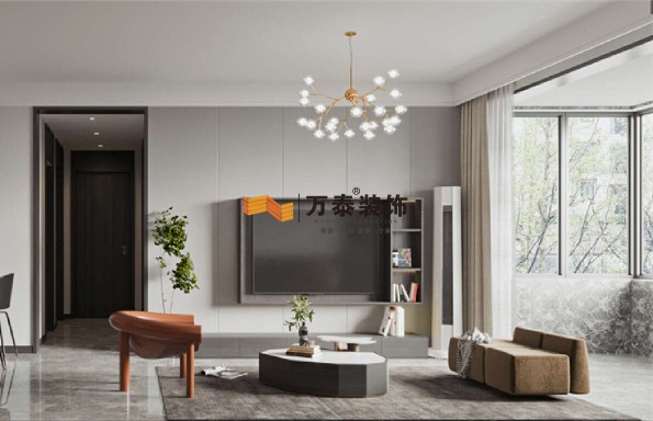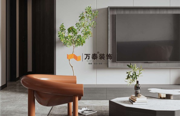 黑白灰是很受年轻人欢迎的一种设计,墙面石材的冰冷与木材温润的质碰撞,更突显出高级感。济南万泰装饰设计师设计的影视墙面使用了浅灰色的墙板,整个造型很简洁,线条也颇为流畅,它没有太多的装饰,但桌子上面摆放了绿色的植物,让这个黑白灰色的空间萌生了生机的氛围。就是因为简洁但不失生机,人们才更加喜欢这样的设计。