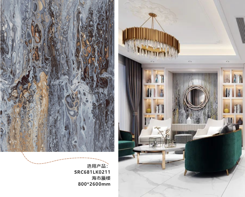 选用产品:SRC681LK0211海市蜃楼800*2600mm金色的吊灯、墨绿色沙发、白色大理石茶几,明快的色相对比,营造出独特的法式风情,使冷峻的空间中多了一种优雅复古的格调,每一处都是满满的高级质感。