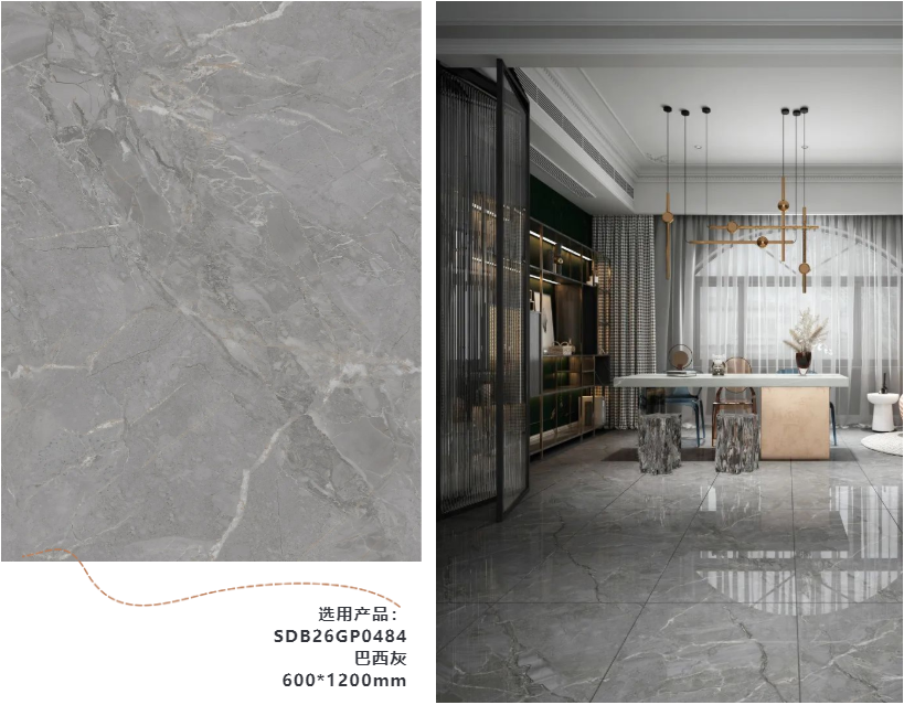 选用产品:SDB26GP0484巴西灰600*1200mm巴西灰简约自然的石纹,带来表现力丰富的线纹走向,张弛有度,恰到好处的色调体现出凝练的时尚感,营造出轻奢浪漫的气息。融合在休闲区内,让人回归最放松的姿态。