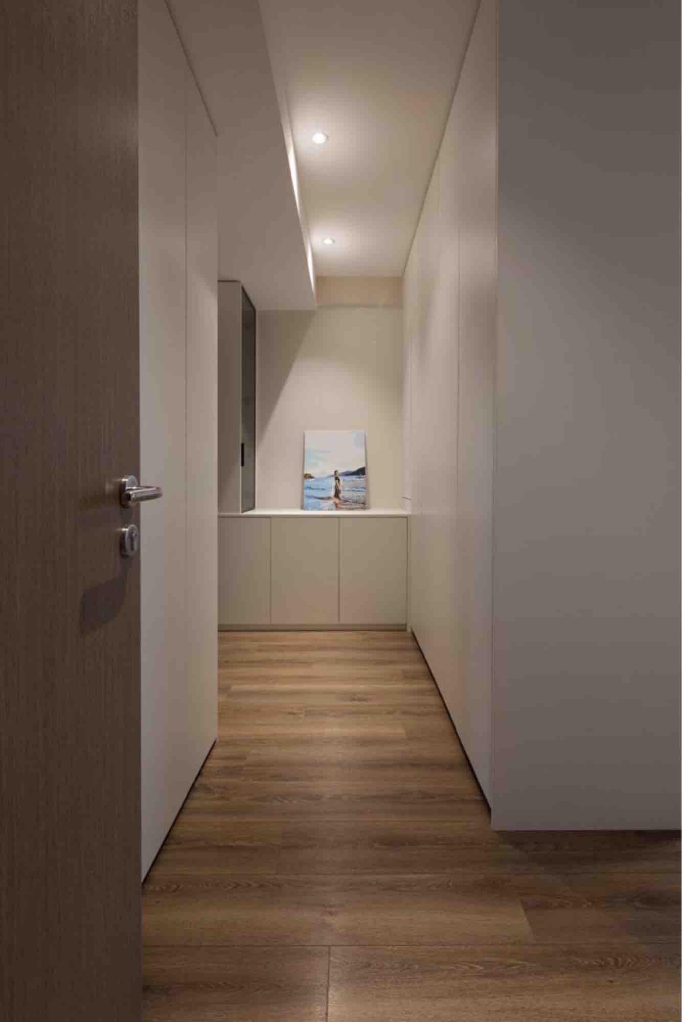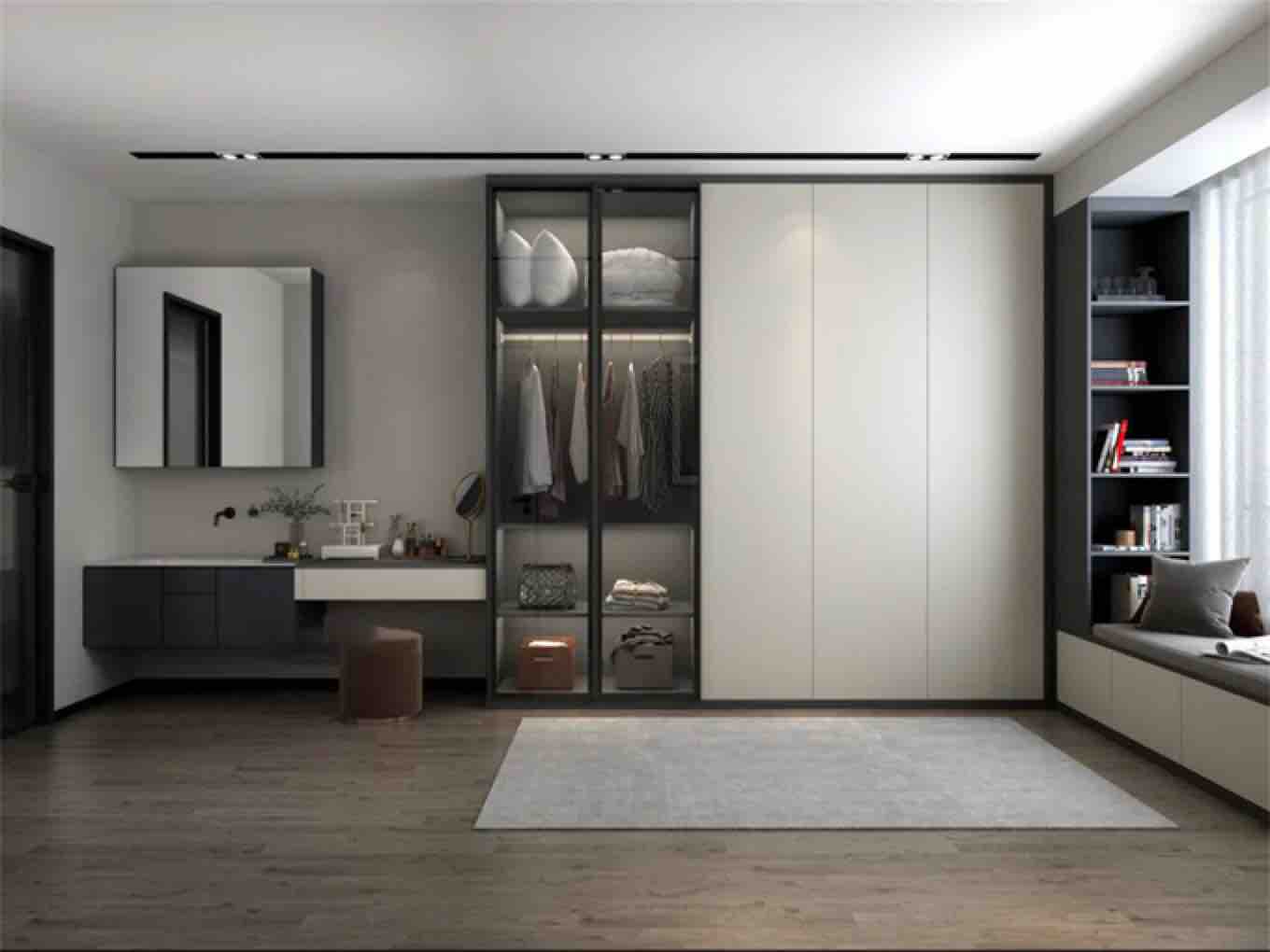 如果你家的衣帽间是二字型布局,衣帽间的过道同时也是作为通向主卫的通道使用,那么你可以将衣柜和梳妆台都做成入墙式布局,柜门柜体则采用防潮不易变形的禾香板或多层实木板。