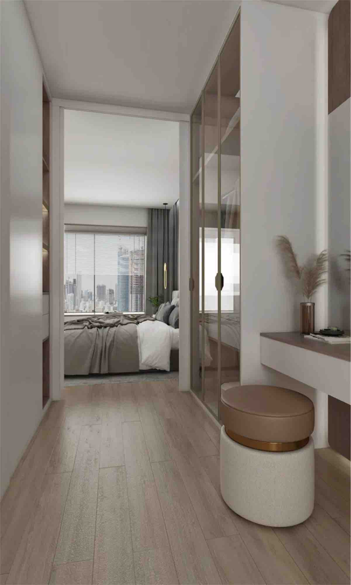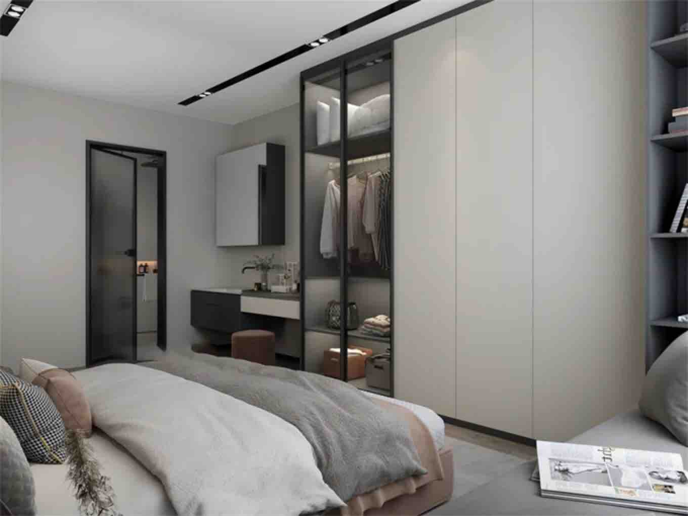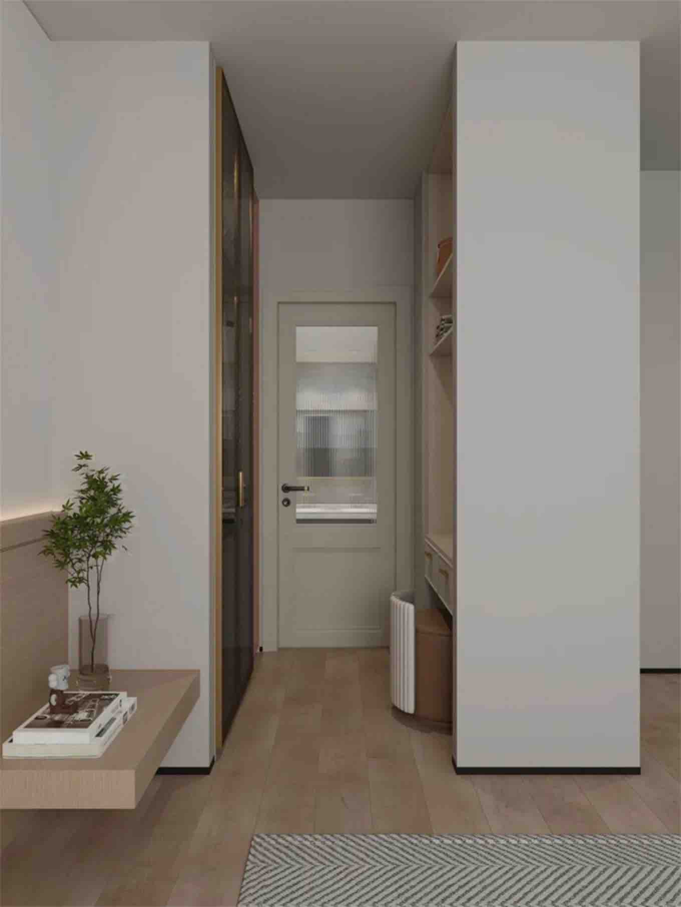 如果担心卫生间和衣帽间的采光问题。衣帽间的柜门也可以采用透光性绝佳的玻璃面板,建议卫生间的门选用透光不透人的玻璃材质,隐私性更高。