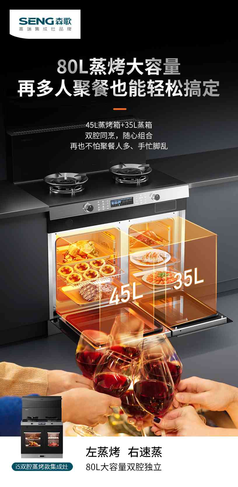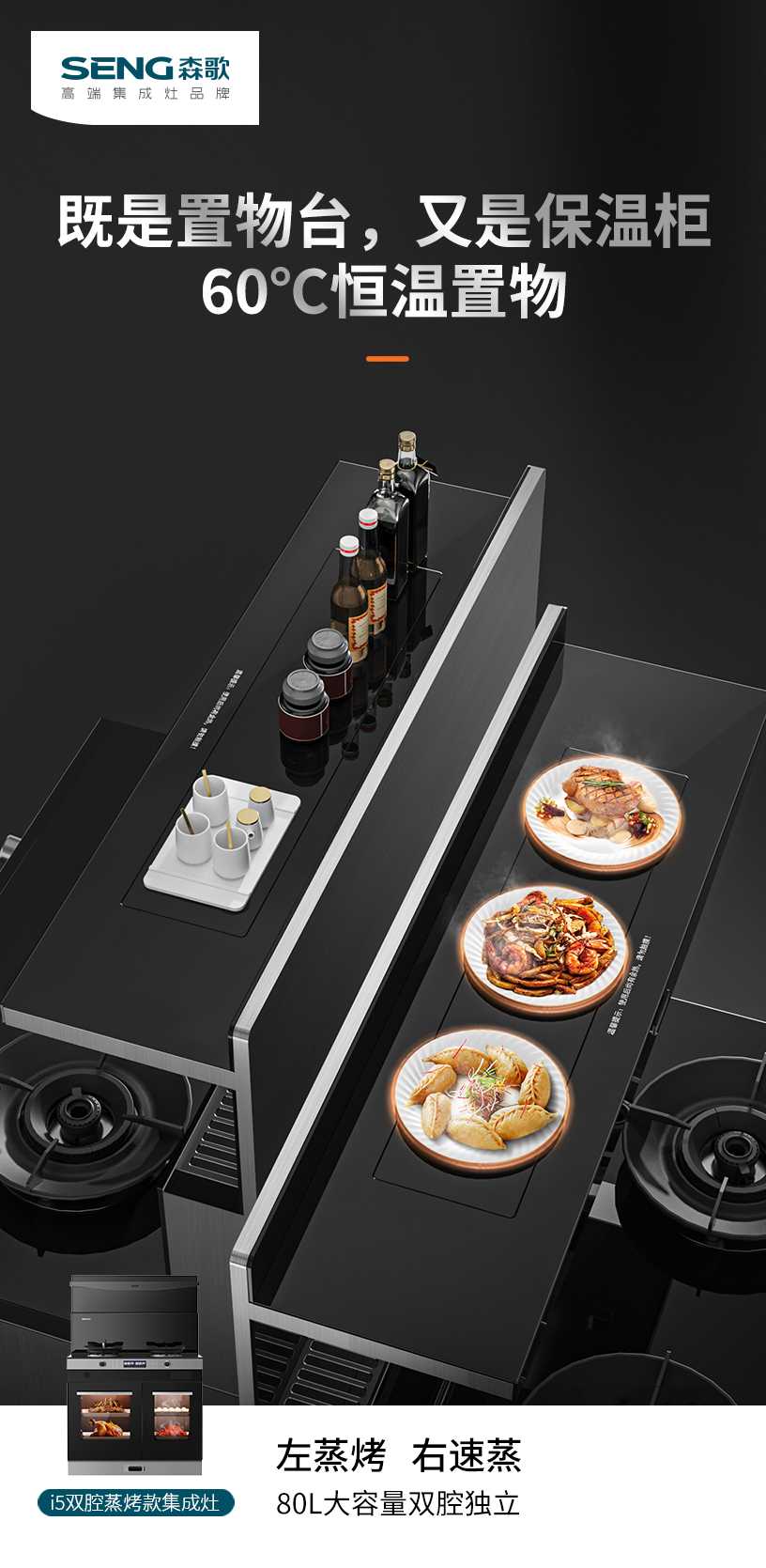 (森歌i5双腔蒸烤集成灶,60℃智能恒温置物台)