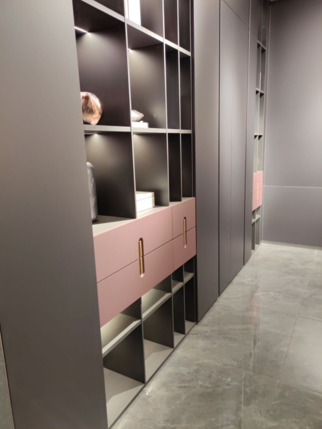 除了封闭柜外,还有以大面积开放柜布局的衣帽柜设计,同样的磨砂黑质感的框架奠定了空间的沉稳大气基调,开放格柜以及玲珑粉抽屉门板的点缀也为其融入了更丰富的视觉元素,紧贴时代潮流美感。