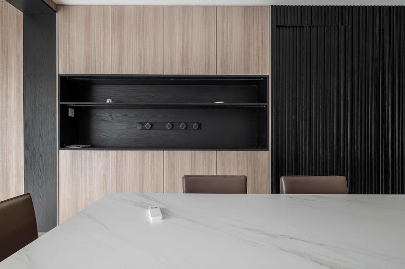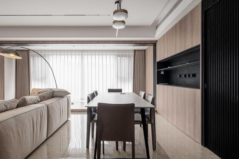 餐边柜中间做了大大的留空部分,以黑色为底,与空间整体色调一致,沉稳大气,留空部分还能用来放置一些餐盘果盘等物品,十分方便。