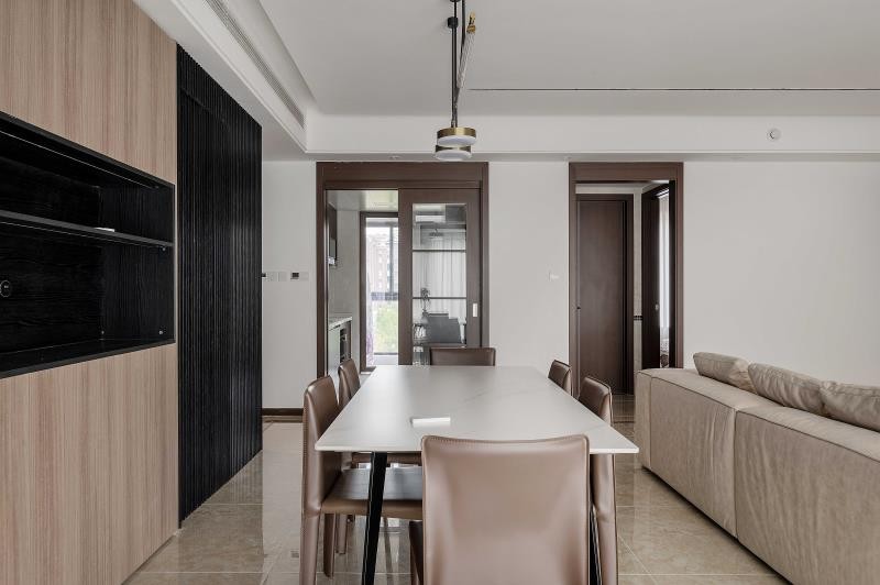可以容纳六人同时进餐的长方形餐桌,选用了白色岩板饰面,带有淡淡的灰色纹理,简约中透露着精致。