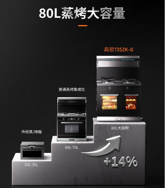 上面的5.0kW大火力燃气灶炒完菜就可以放在60℃恒温置物台,寒冷的冬天菜品也可以时刻保温。所有菜品都做好,正式开吃的时候,所有的菜都是热的。另外,天冷不想起床做早饭,还能使用24h智能预约功能做健康的早餐,蒸蛋、蒸玉米、蒸馒头全都可以。而且只需要使用一个箱体就能完成,相对来说比大容量蒸烤箱更加节能。作为今年双十一热门产品,森歌T3独立蒸烤升级款集成灶在技术上实现了大幅升级,我觉得很有可能成为今年集成厨电行业里的王炸产品。炸点1:容量升级14%。此前,森歌T3ZK-G独立蒸烤集成灶的蒸箱是40L,烤箱30L。升级后的森歌T3独立蒸烤升级款集成灶的蒸箱是45L烤箱是35L,改变了以前制作大食材食物的局限性。两个箱体共计80L容量,鱼、虾、海鲜、面点各种各样的菜式,再也不需要分两次做。