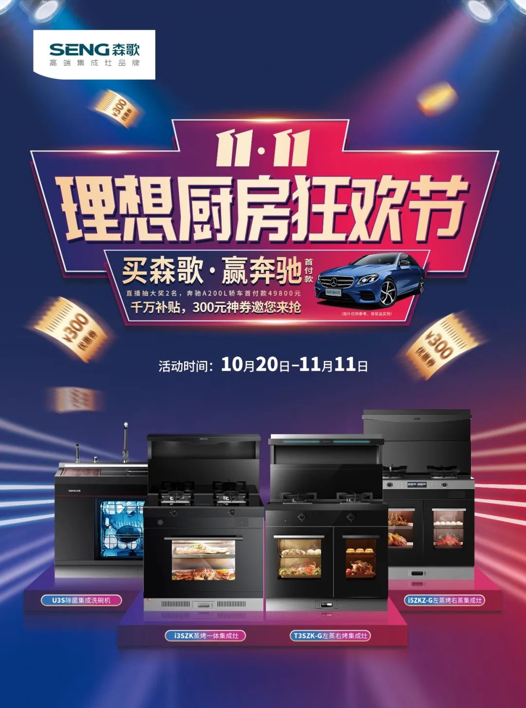 炸点3:作为今年双十一最卷的智能集成厨电品牌,森歌直接开启了买森歌,赢奔驰,下单即可参与抽奖,豪送2辆奔驰首付款!讲真,没有任何一个品牌有它“豪横”了,有它敢送的!