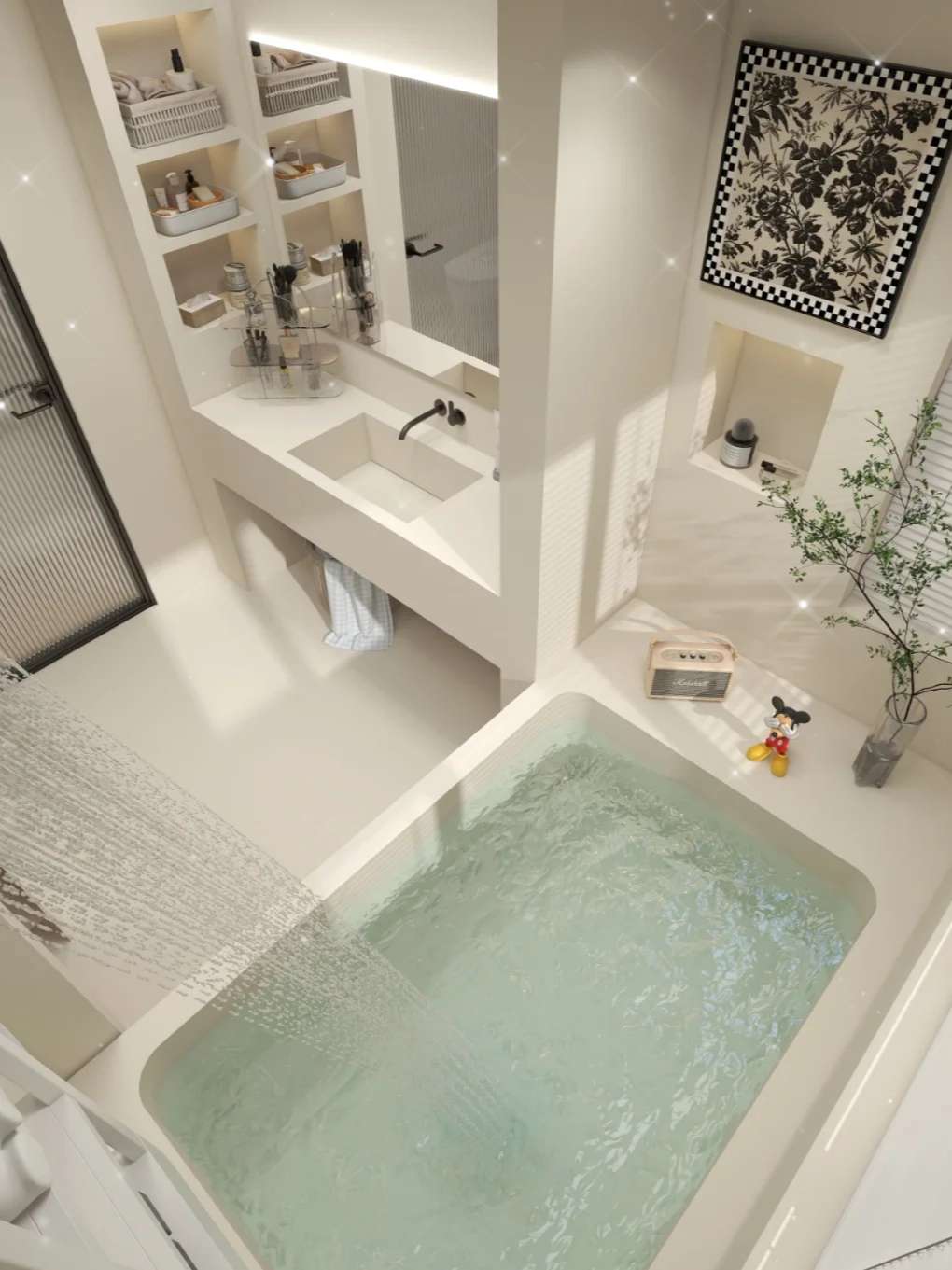 小浴室需要实现泡澡的快乐可以试试安装那种坐式浴缸,这种浴缸占地面积小,但是也能享受泡澡的乐趣。而且这种坐式的浴缸包围感会强一些,泡澡的时候能给人一种安 全感。