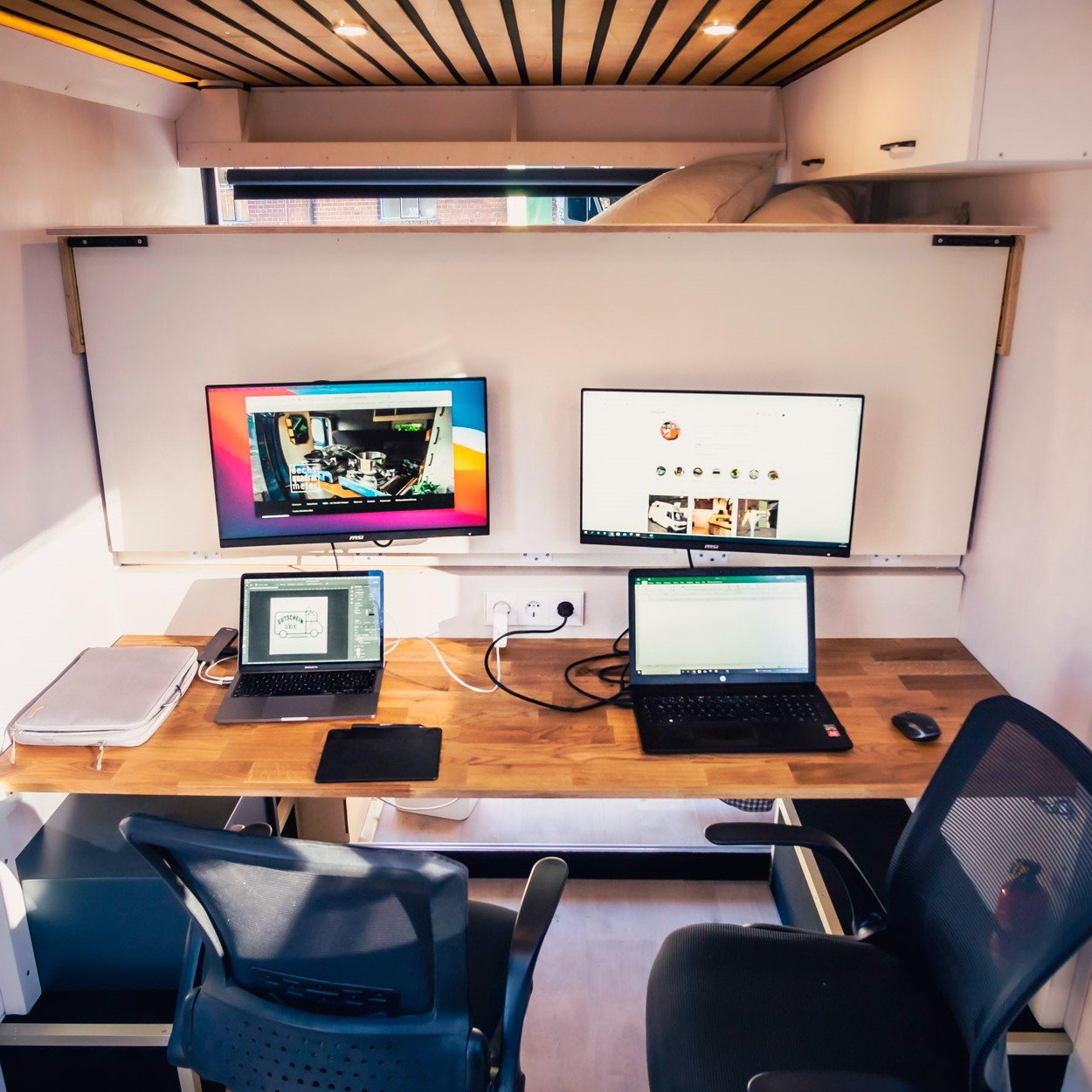 经过一番精心的设计改造后,这个名叫“Franzi”的车最终拥有了一个可供两人办公用的办公区域,自然大气的原木办公桌,配备了丰富的插座口以及舒适的办公椅,看起来跟写字楼里的办公室无异。