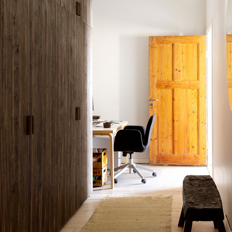 这一个入门储物柜以及一张木质小板凳是来自芬兰的一户家庭,这样一个有着严峻气候条件的国家里,你可以在他们的许多私人住宅中找到使用德国Osmo欧诗木木蜡油处理过的木制表面哦!表面仅需涂刷两遍,给这个储物柜门和小板凳重新披上了一层复古深色的外观的同时,还具备了防水、防污的特性,完全干燥后对人体、动物和植物无害。并且微孔透气的表面, 木材能自由呼吸, 可以吸收和释放水气, 不会有脱漆、起泡等问题发生。
