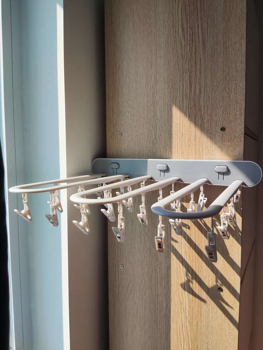 折叠晾衣架这个晾衣架放在浴室或者是阳台上都蛮方便的,而且还有小夹子,晒一些小衣服或者袜子都还挺方便的,不用的时候也能折叠收纳起来,价位也合适,可以冲。