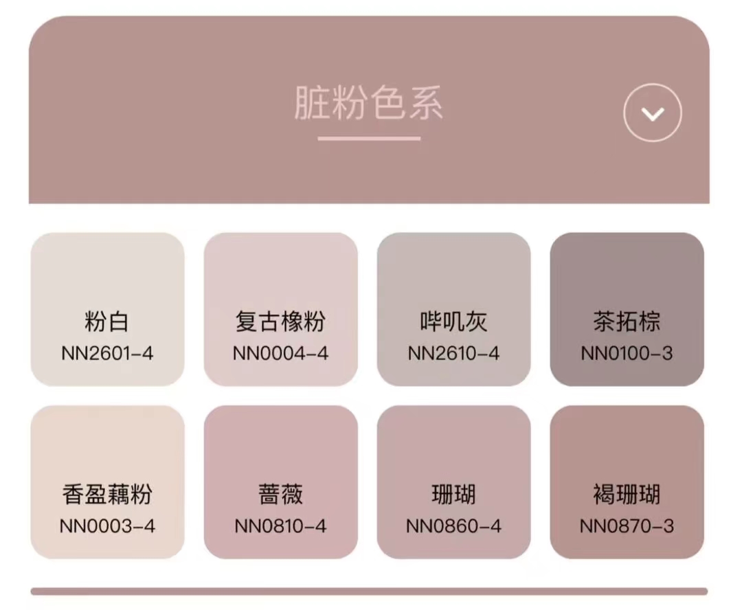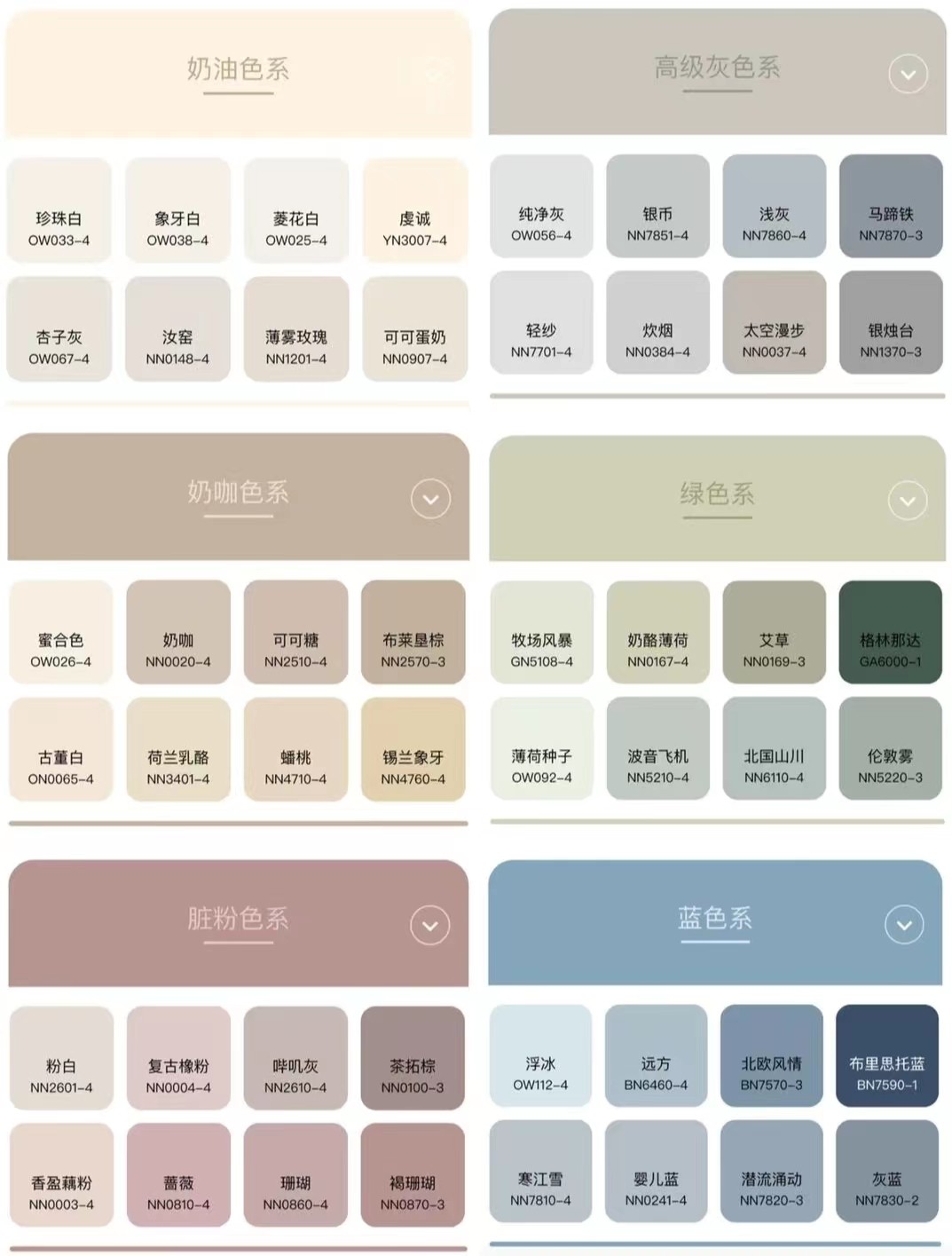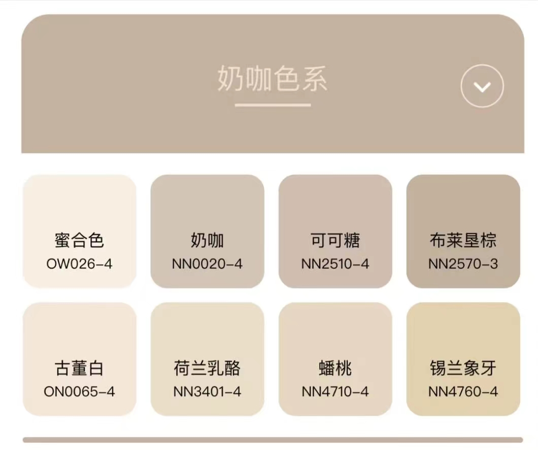 奶咖色系:奶咖NN0020-4(颜色较浅 适合卧室背景墙)可可糖NN2510-4(颜色适中 适合卧室背景墙)布莱垦棕NN2570-3(颜色较深 适合卧室背景墙)奶油色系:杏子灰OW067-4(温馨有清凉感 适合客厅大面积刷)汝窑NN0148-4(偏柔和 适合客厅大面积刷)可可蛋奶NN0907-4(温柔的淡黄色 适合客厅大面积刷)粉色系:复古橡粉NN0004-4(颜色较浅 适合女孩儿童房通刷)蔷薇NN0810-4(颜色适中 适合女孩儿童房通刷或背景墙)褐珊瑚NN0870-3(颜色较深 适合女孩儿童房背景墙)