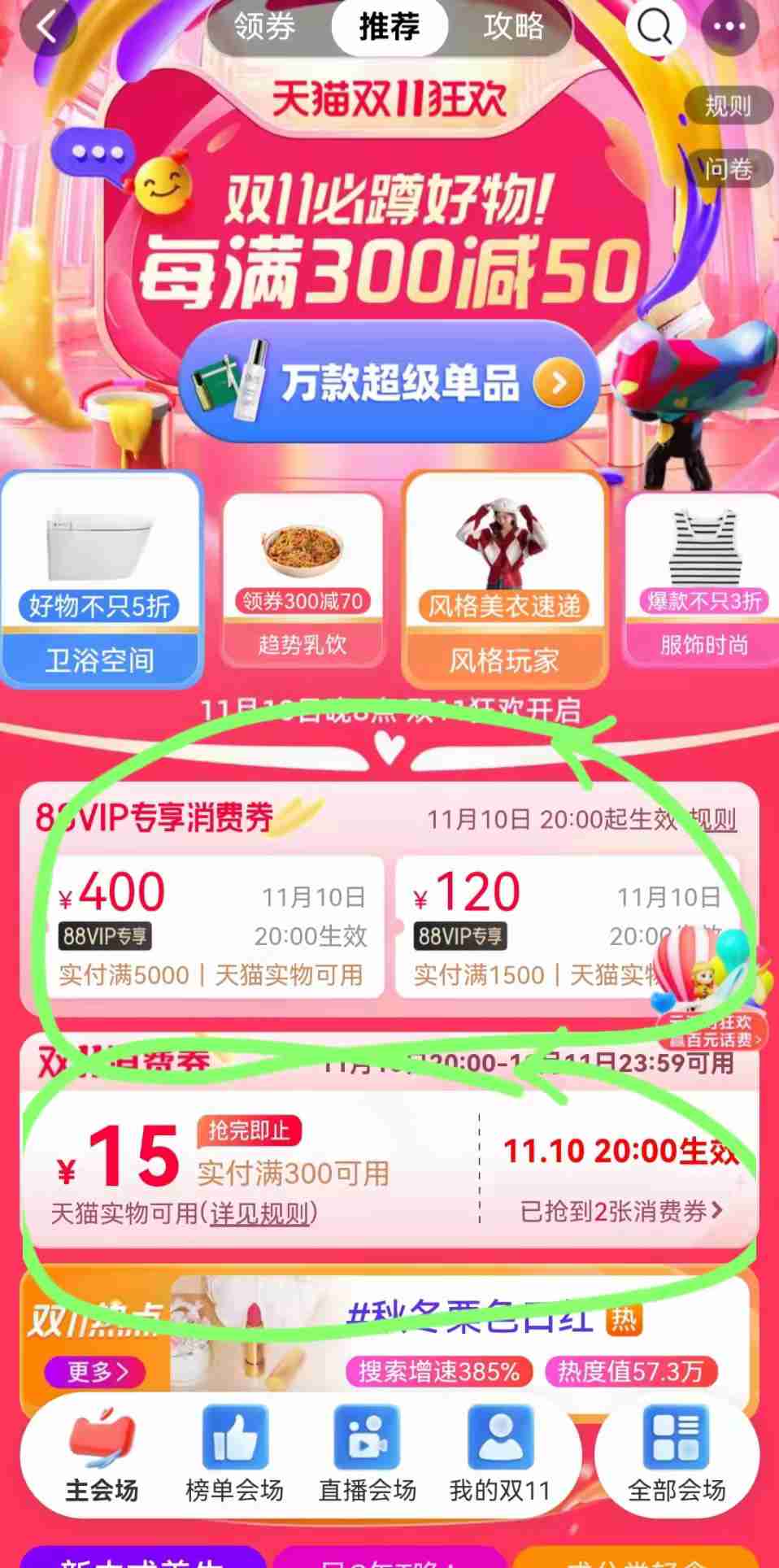 除了88Vip的两张1500-120和5000-400外,还可以领: