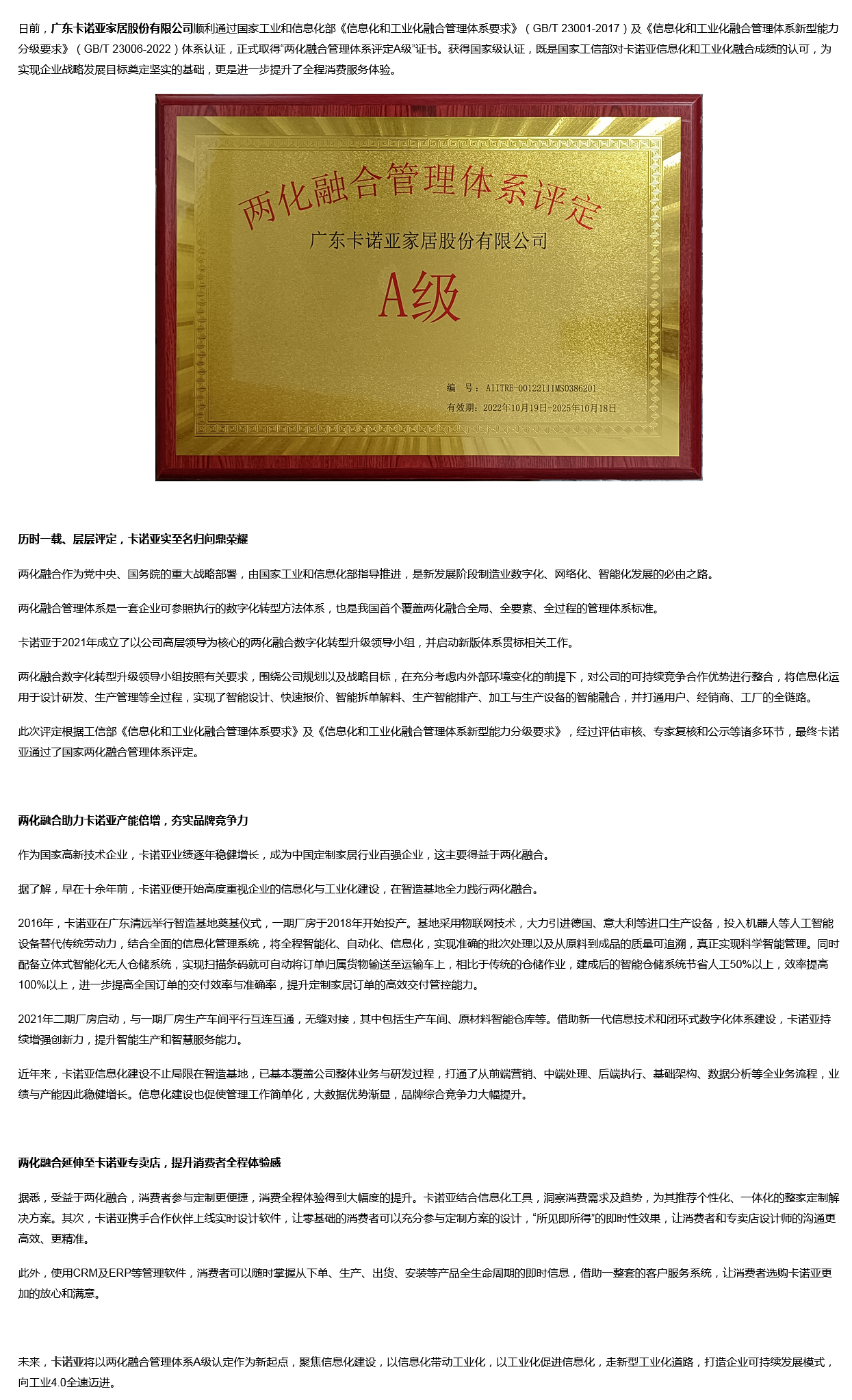 重磅荣耀|卡诺亚家居斩获“两化融合管理体系评定A级”认证