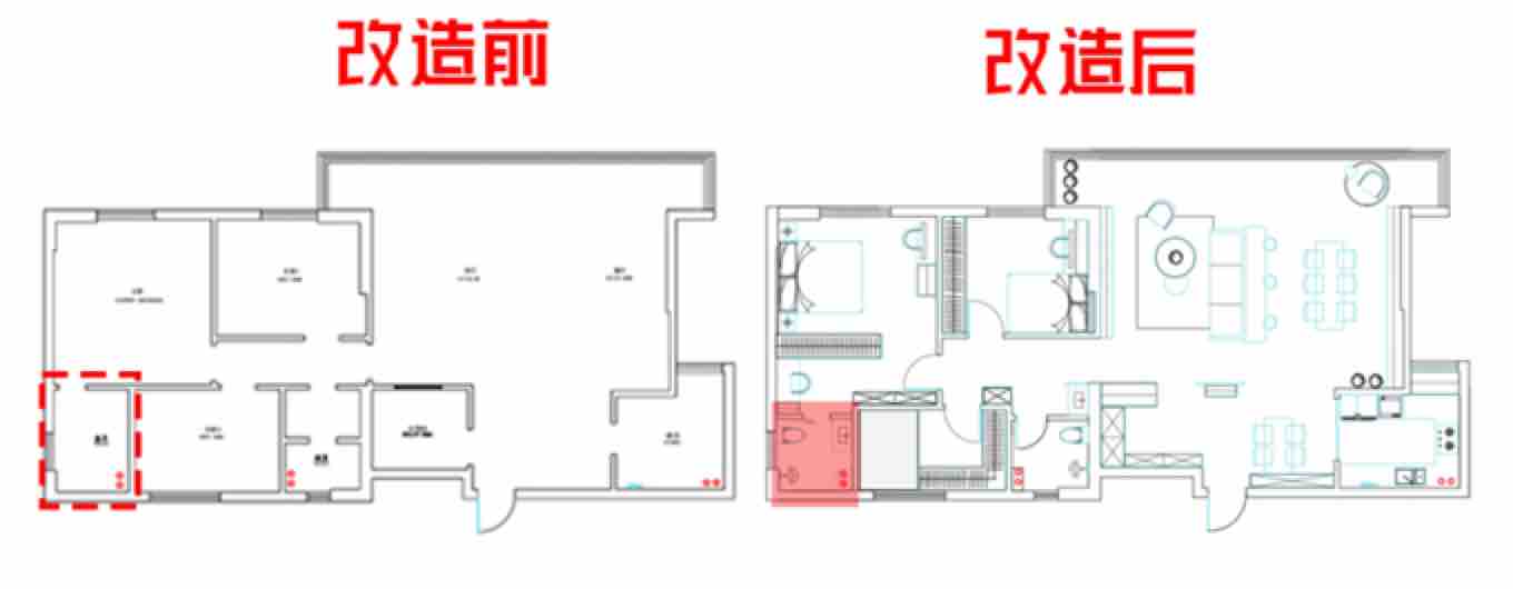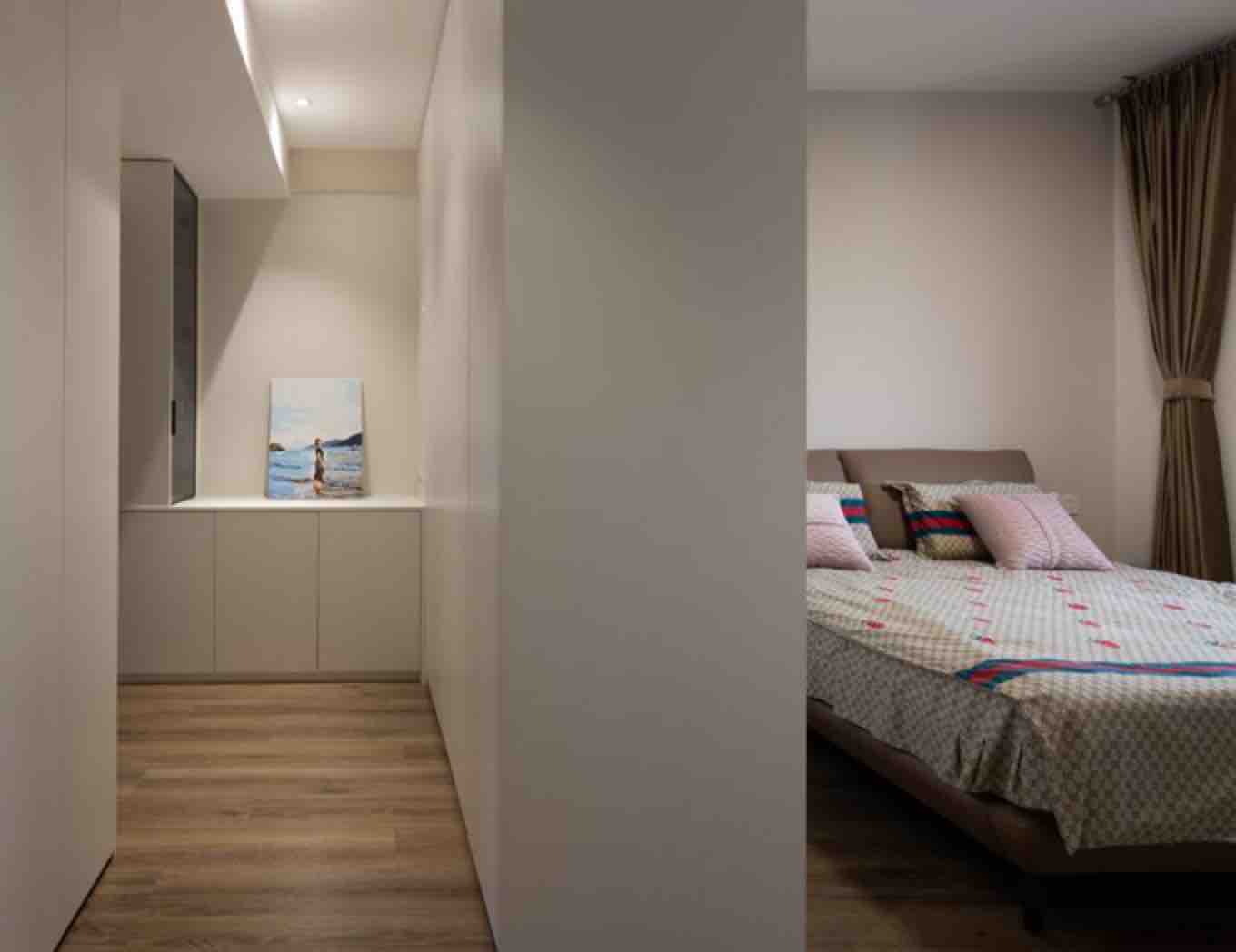 例如我们过去做过的一个案例,原户型卫生间门正对床头,为了改善这窘迫的格局,将主卧富余的空间改为衣帽间。衣柜背面是没有砌墙,而是选择背景板做装饰,连刷漆的钱都省了。