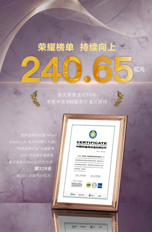 美克美家美克美家成立于2002年,是国内家居领域知名的美好生活方式品牌,以“高品味、经典、浪漫、优雅”为品牌价值主张,将国际家居零售行业的成功经验与中国市场结合,开创了一站式置家理念。品牌承接零售、全屋定制项目,专注提供设计咨询、软装配饰、家居用品为一体的家居整体服务,致力于通过产品及设计的维度,为住户提供艺术、健康、舒适的居住环境。品牌曾荣获2022中国500最具价值品牌、2021年中国家居冠军榜-行业领军品牌等多项荣誉,备受行业内外专业人士及广大消费者认可。