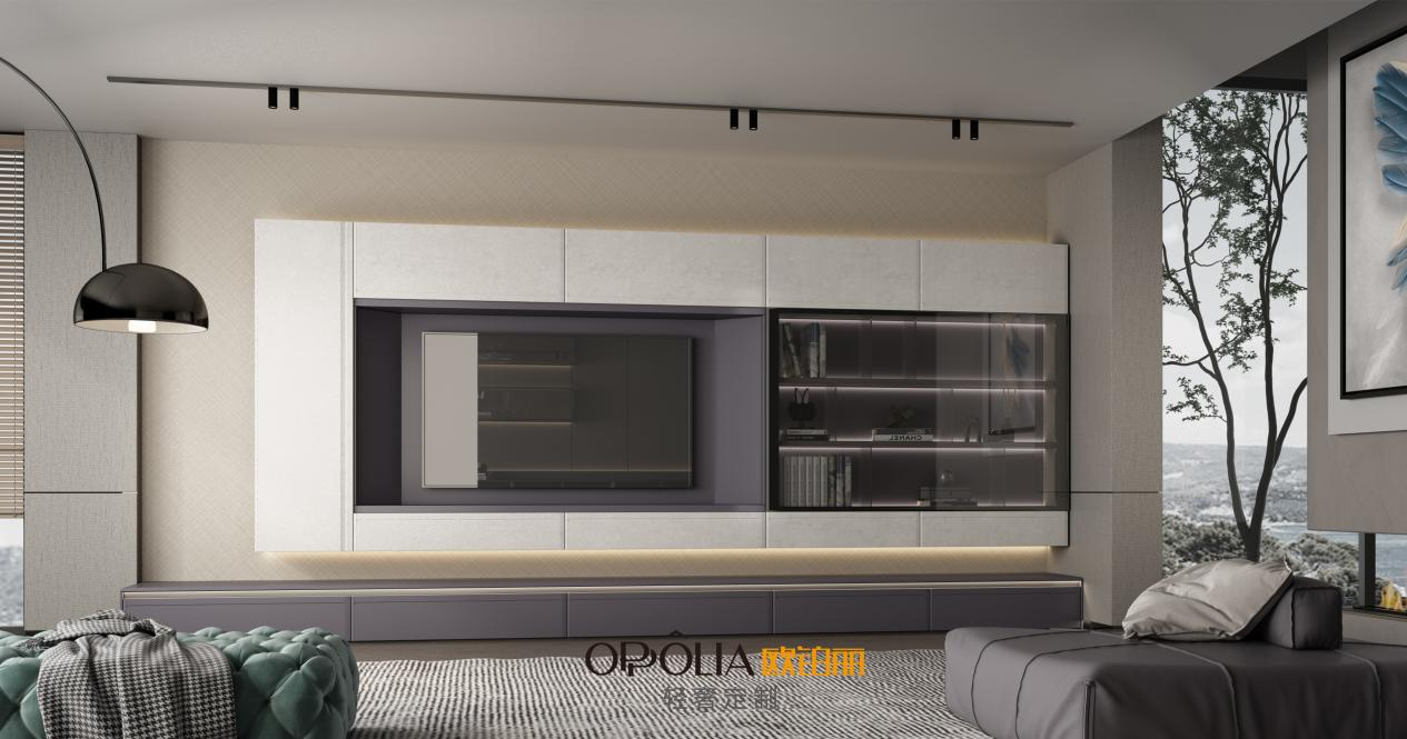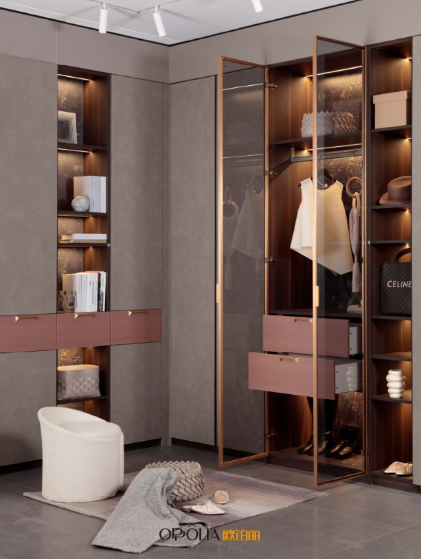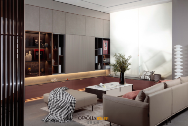 3、空间分区轻奢设计风以简约为主,但简约≠简单。以欧铂丽奢·星澜系列为例,卧室和衣帽间合二为一的设计,让整体空间多了几分灵动,开放式衣帽间层次分明,让各类衣物摆放得更清晰,令整个空间井然有序,将空间的利用率调到最大,高效利用墙面空间。如欧铂丽雅·云兹系列的客厅设计,充分考量居者生活需求与空间因素量身定制,利用了墙面空间打造整墙收纳的电视柜,大面积开放柜兼具收纳和展示功能,内藏温馨灯光增添客厅轻奢感。