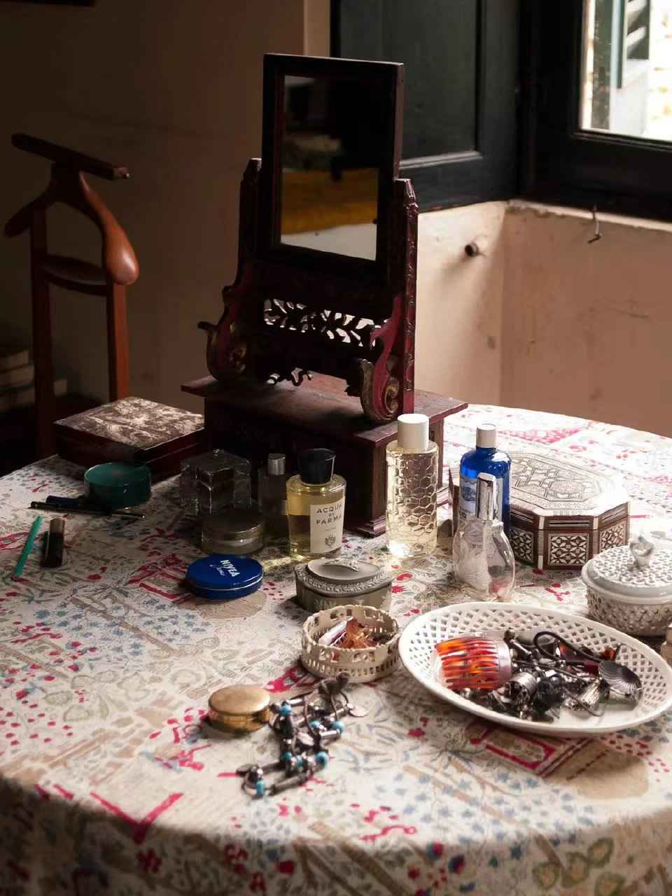 树荫下的餐桌 晚风吹起走廊的窗帘