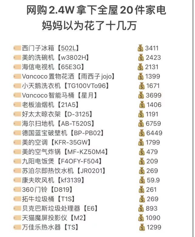 网购2.4w拿下全屋20款家电🤤大家快看值不
