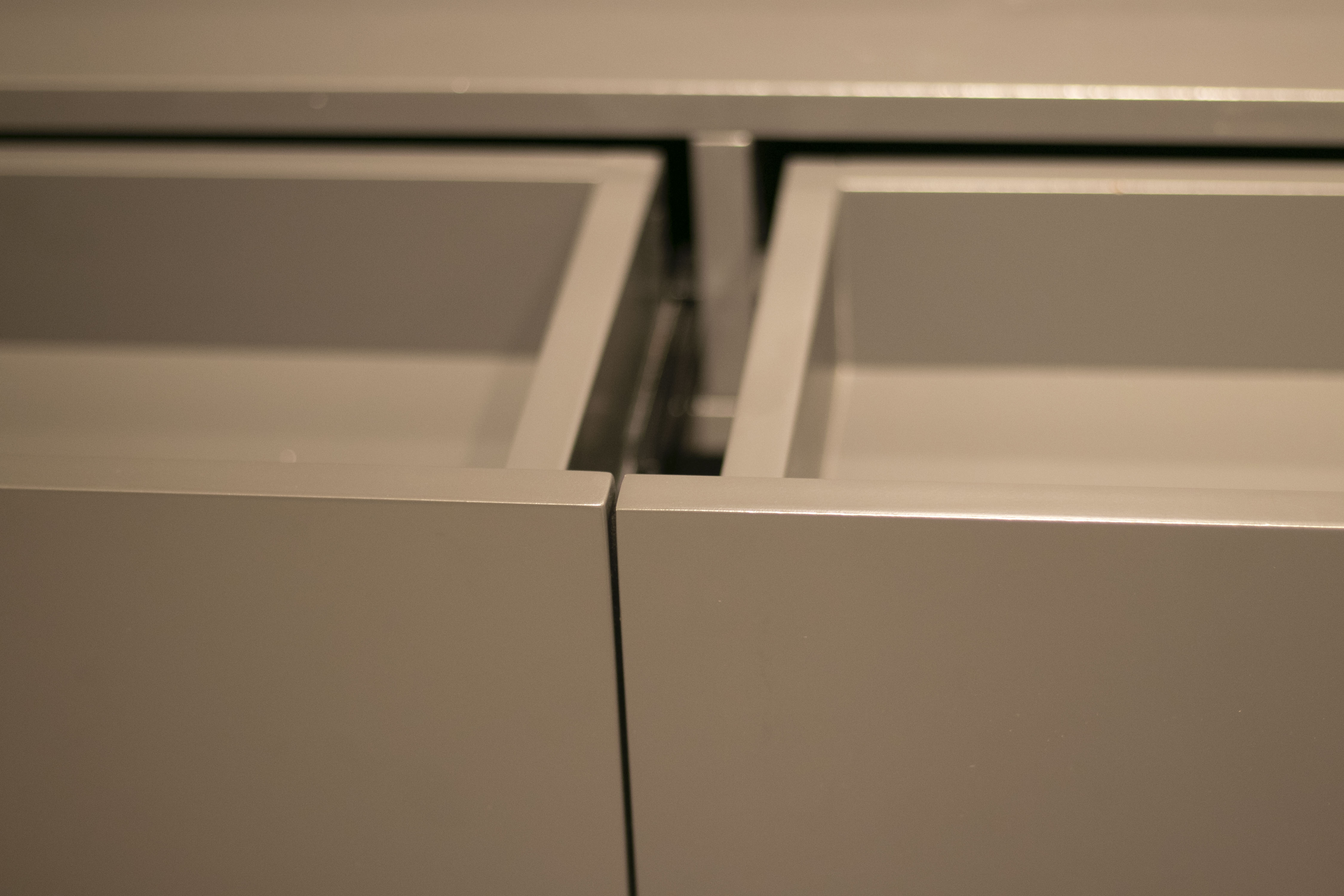 轻轻触摸柜门,发现相较于油漆板的手感干涩,水性漆摸起来触感如婴儿肌肤般柔滑,因为水性漆的分子细度25微米,只有三分之一头发丝的细度,这得益于卡诺亚水性漆历经23道工艺的淬炼打磨。据了解,水性漆面要做到不流挂,对生产设备的要求非常高,它是采取3底2面的加热烘干原则,也就是漆面刷一次烘干一下,每次6小时,温度还必须严格控制在35-45℃,这样才能避免流挂出现。经过3遍底漆 2遍面漆 7次打磨固化的水性漆面板,保证了漆面平整饱满,触摸毫无塑料感。