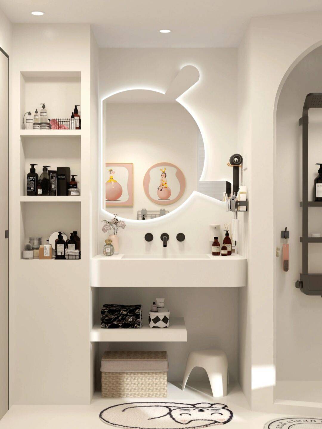 洗漱区 是自砌的洗手台,旁边做了壁龛,可以很好的收纳,兔子镜配上灯灯简直可爱🤗到爆炸了。显得浴室简单又纯真
