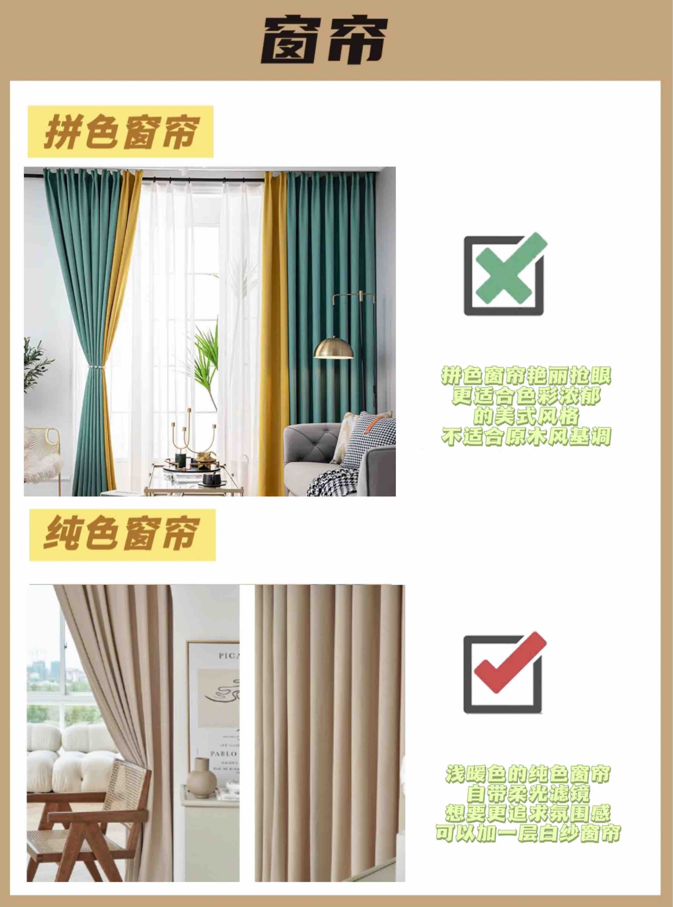 尽量不要选择拼色窗帘,最好选择纯色好搭配家具。