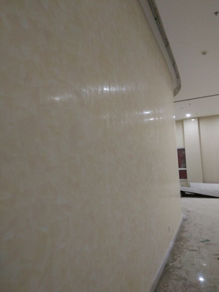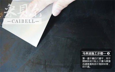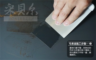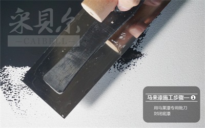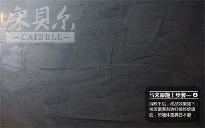 马来漆施工步骤:①用马来漆专用批刀平批一遍封闭底漆。②基地平整后,在施工墙面上,将调好的马来漆用马来漆批刀平批一遍,越薄越好。③第一遍干燥后打磨平整,用不锈钢抹刀粘上少量马来漆,迅速垂直批刮不规则纹理,待干透。④待晾干后,成品效果如图4,纹理错落有致。如果想要高光的效果,可一直重复第二第三道步骤,一般做高光的效果需要重复5-6遍,才能让墙面达到大理石那样光洁亮丽。