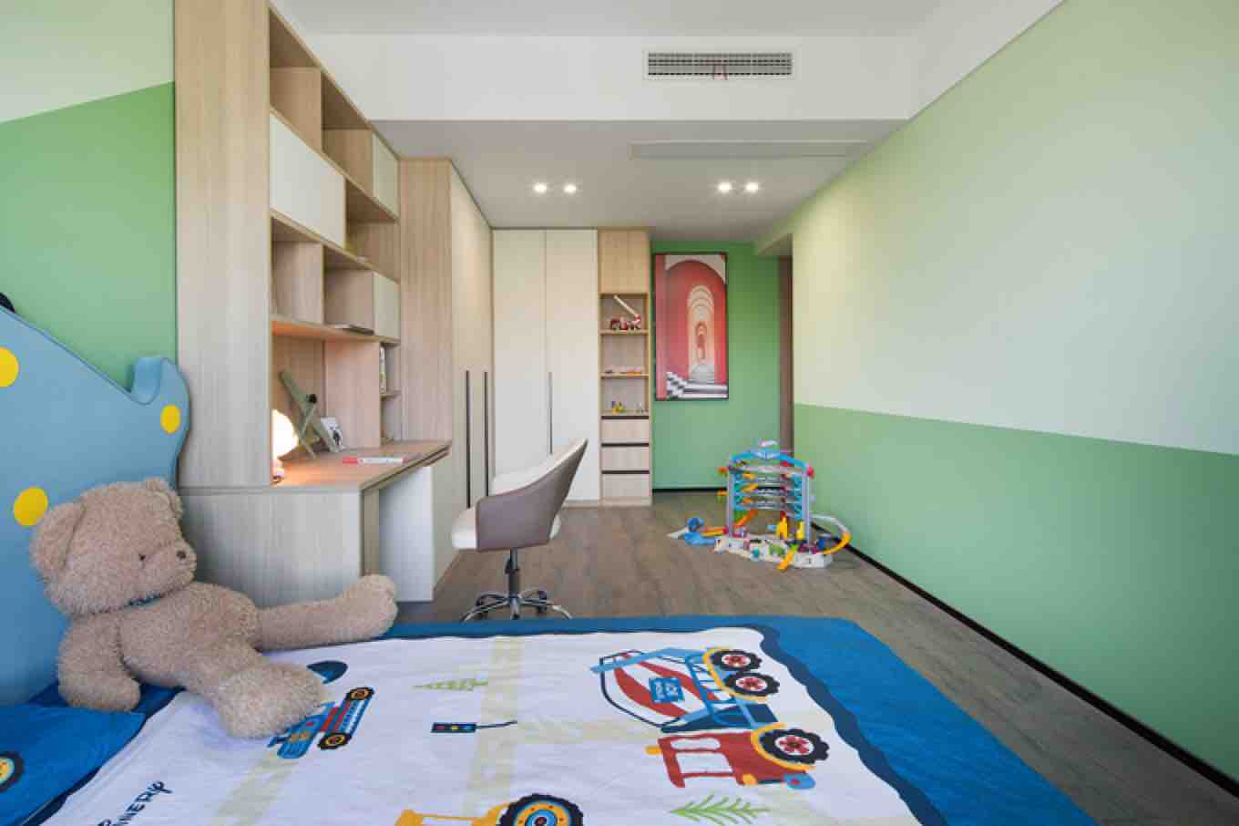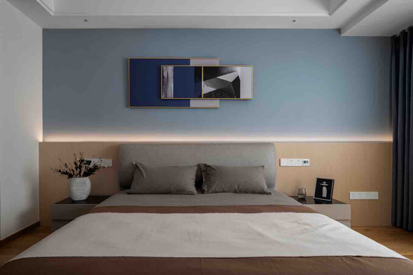 例如这套案例中,则采用的是蓝色墙漆搭配原木色护墙板,内嵌灯带,氛围感直线上升,起夜的灯光也不会晃眼。