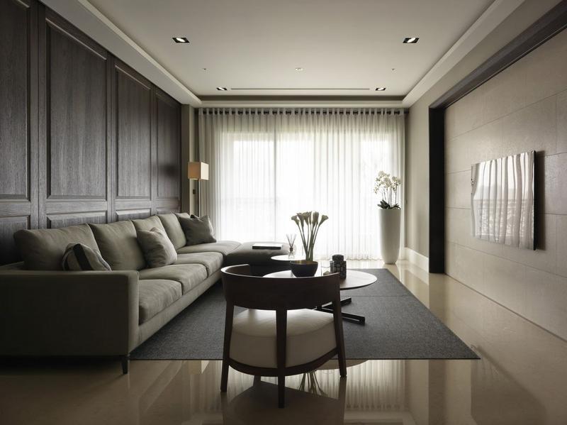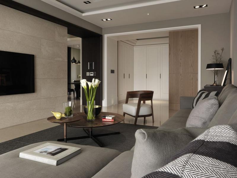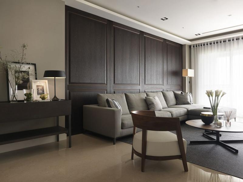 客厅背景墙选用厚实的柚木,深咖啡色的木质材料看着优雅而高贵。...