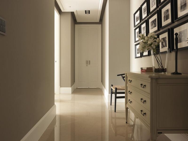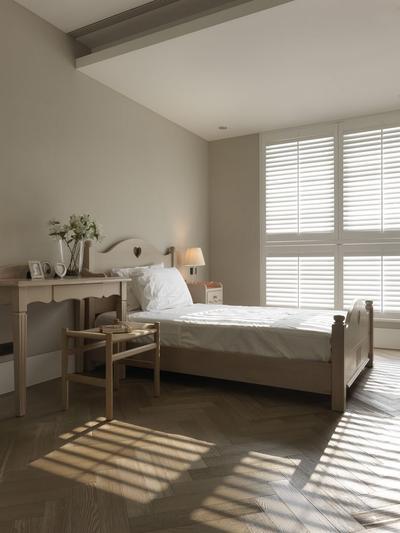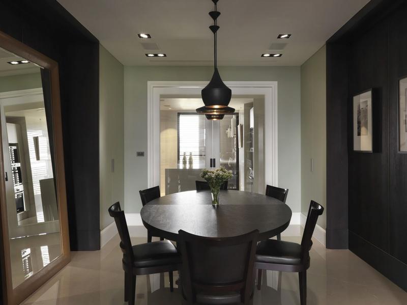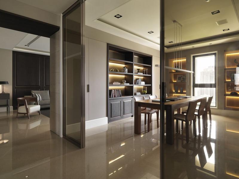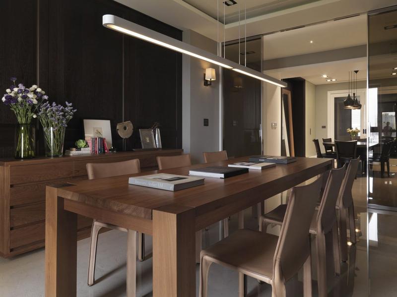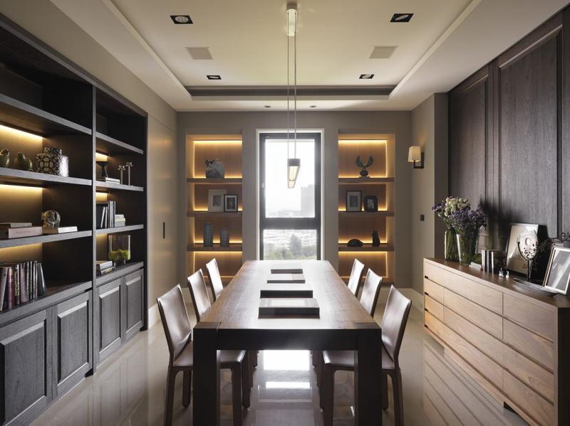 客厅背景墙选用厚实的柚木,深咖啡色的木质材料看着优雅而高贵。书房内放置了一张巨大的长桌,需要时也能在这里就餐。