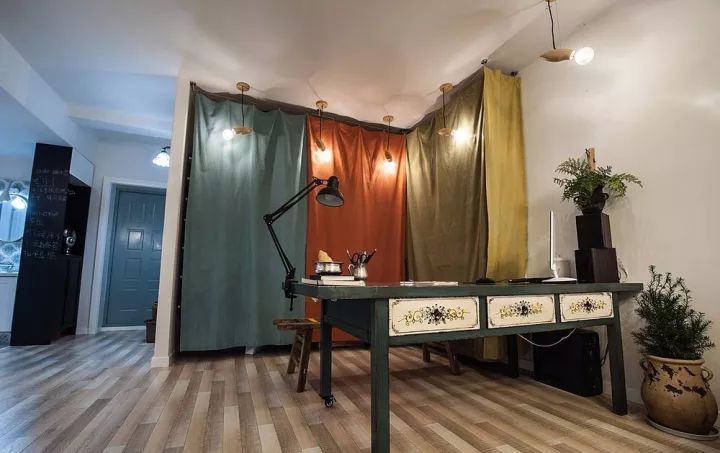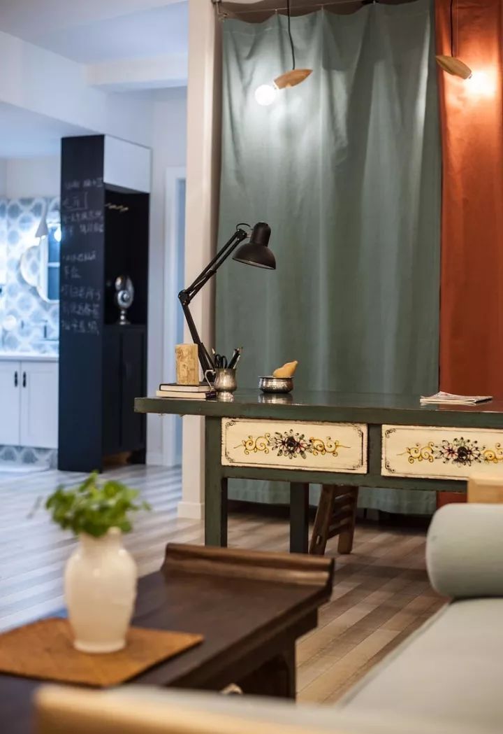 ▲黄橙蓝的三色布帘做成了书柜的柜门,简约而别致。搭配上复古的墨绿色印花书桌和吊灯,映出满满的怀旧风情。设计师让老物件在新房子里展现了不一样的精彩,看似随意的摆放却更增加了生活的氛围。