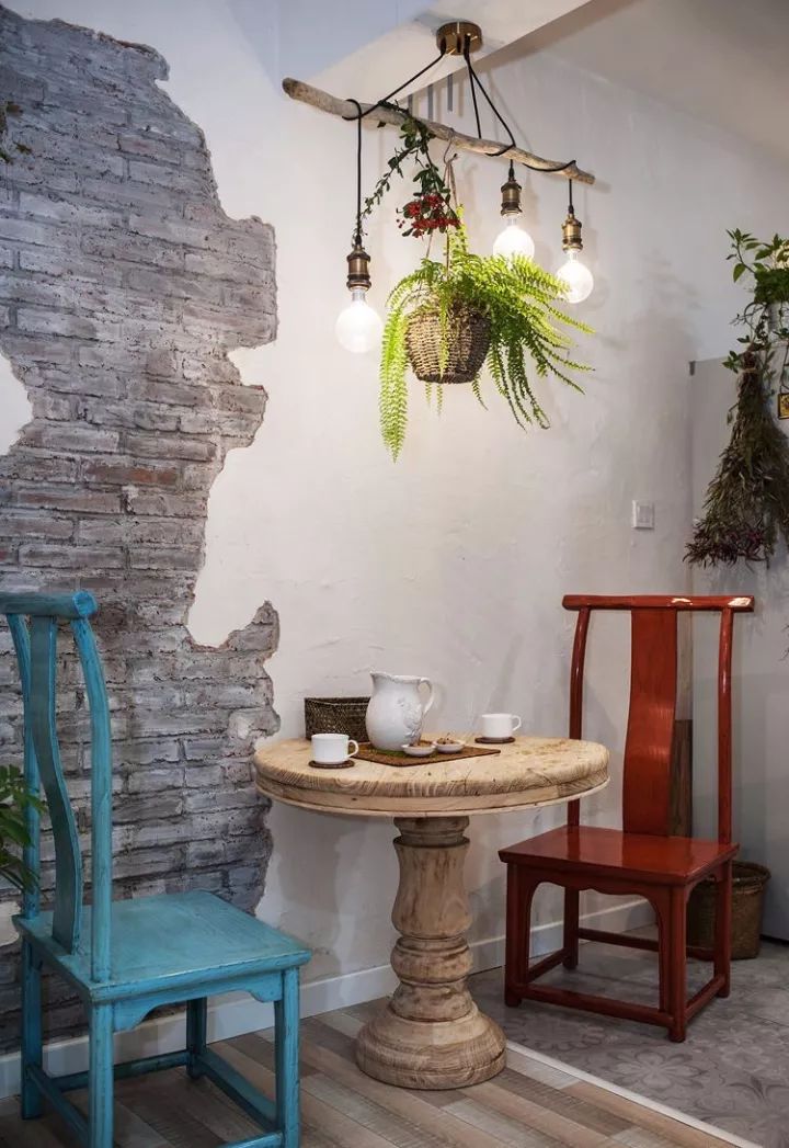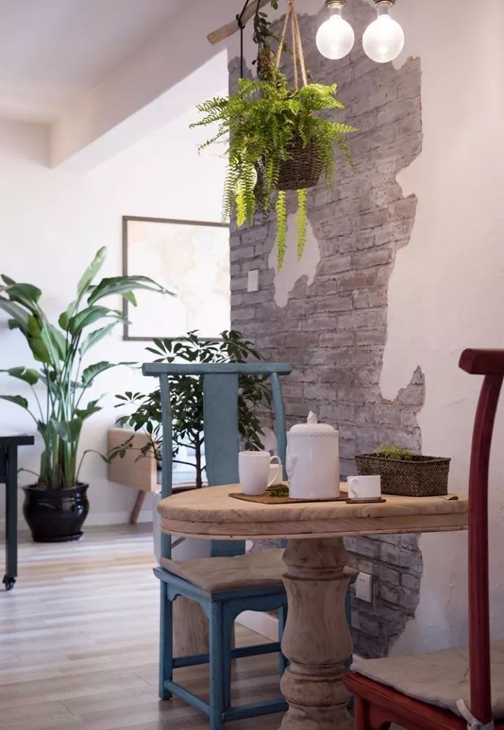 ▲设计师故意在白色墙壁上留出了一片砖头的图案,蓝色与红色的椅子搭配上做旧的圆木桌,上面吊上一盆翠绿的小盆栽,翠绿的叶子在白织灯的照耀下变成了嫩绿,纯白色的茶具又与墙壁相得益彰。让小小的餐厅充满了文艺气息。