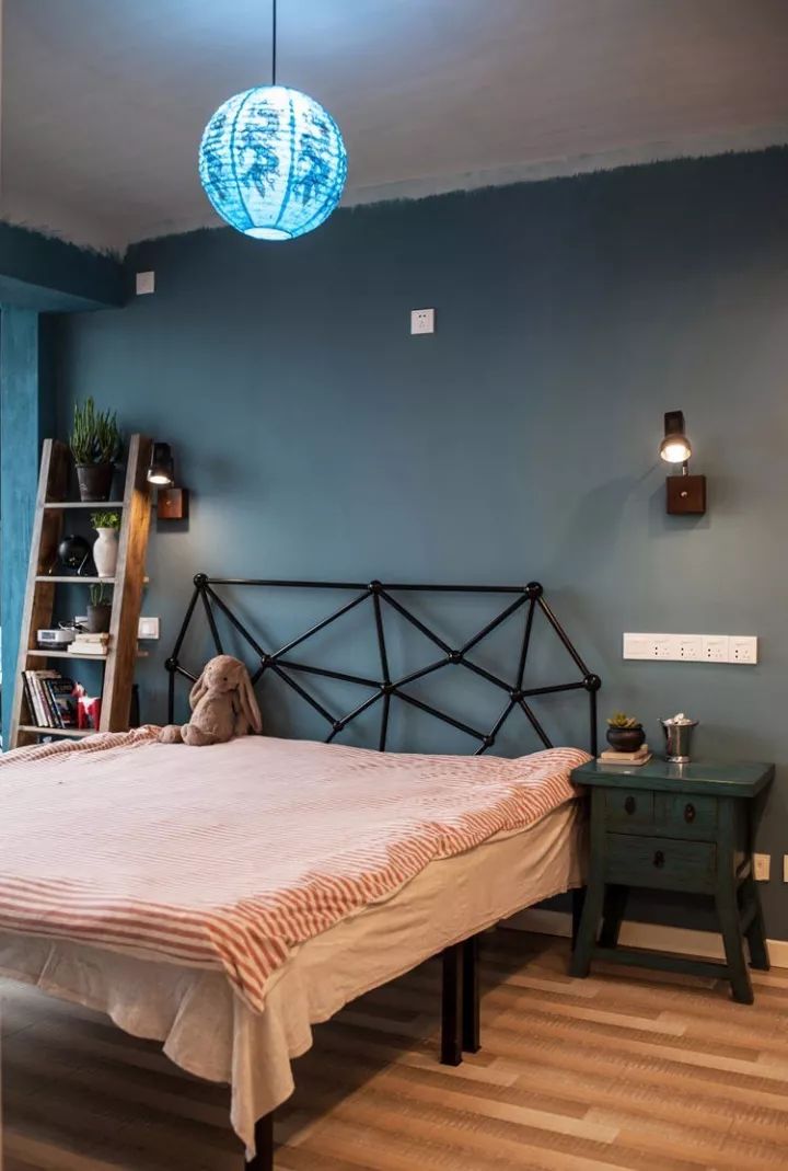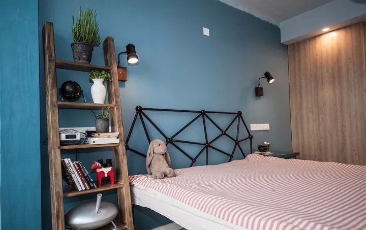 ▲带着神秘色彩的深蓝色背景墙给卧室空间加入了清爽新鲜的气息。由实木直梯改成床头置物柜,让房间显得自然清新。
