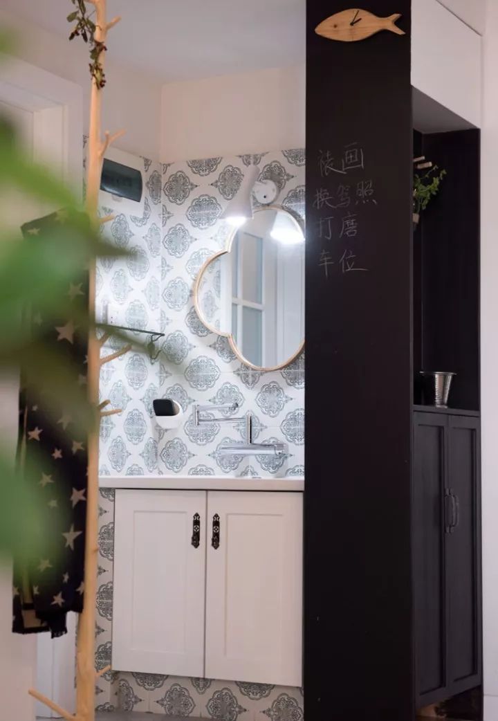 ▲干湿分离的设计更加方便使用,花型镜子与墙砖呼应,精致又美观。玄关柜的侧边设计了黑板墙,随手记录当下。