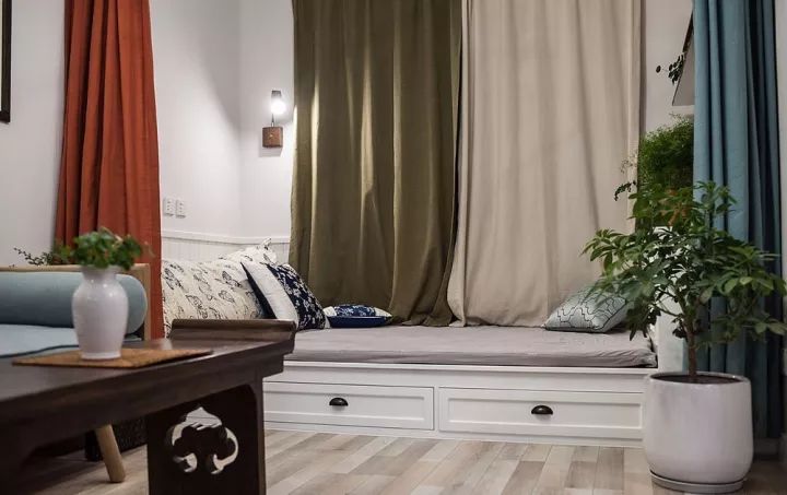 ▲榻榻米是小户型节省空间的最佳选择,除了美观性外,还能将空间得到最大运用。日常可以作为收纳看书喝茶的休闲场所,家里有客人入住时,拉上帘子又可成为独立的房间。