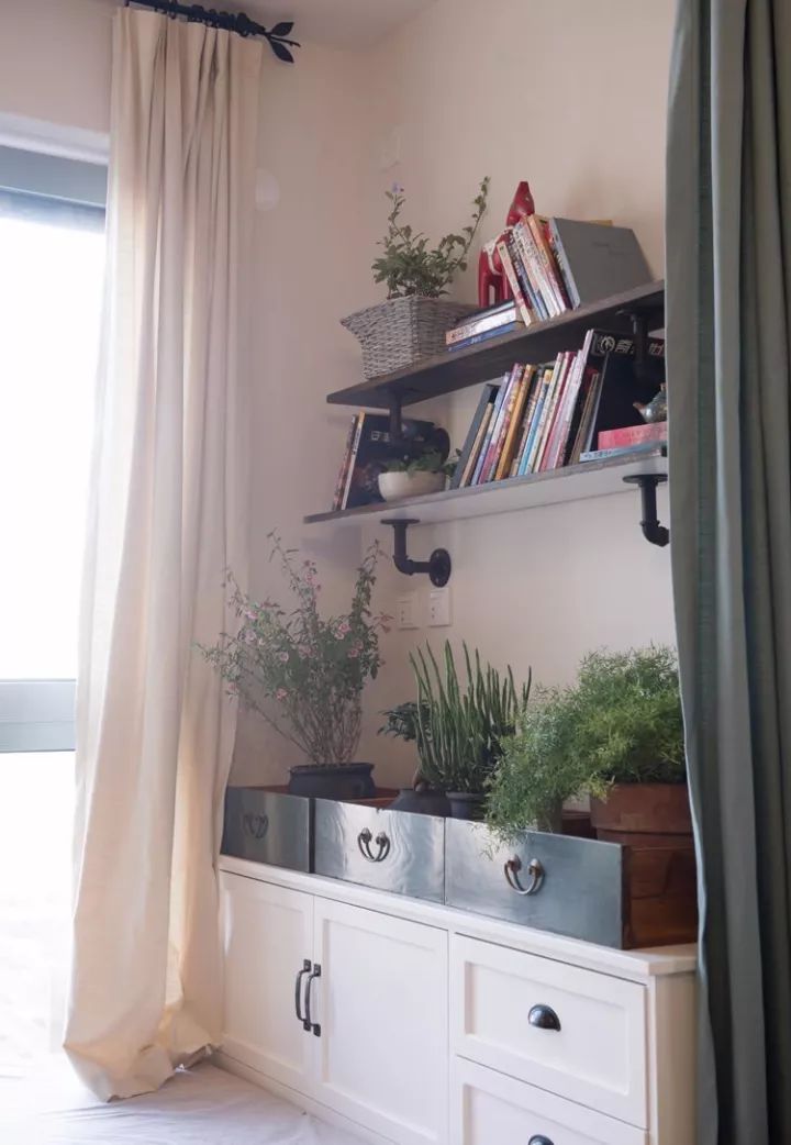 ▲榻榻米一角,设计师变废为宝,把一些老家具从丢弃毁掉的结局里拯救出来,柜子用作博古架,抽屉用来种花,随性而不显凌乱。