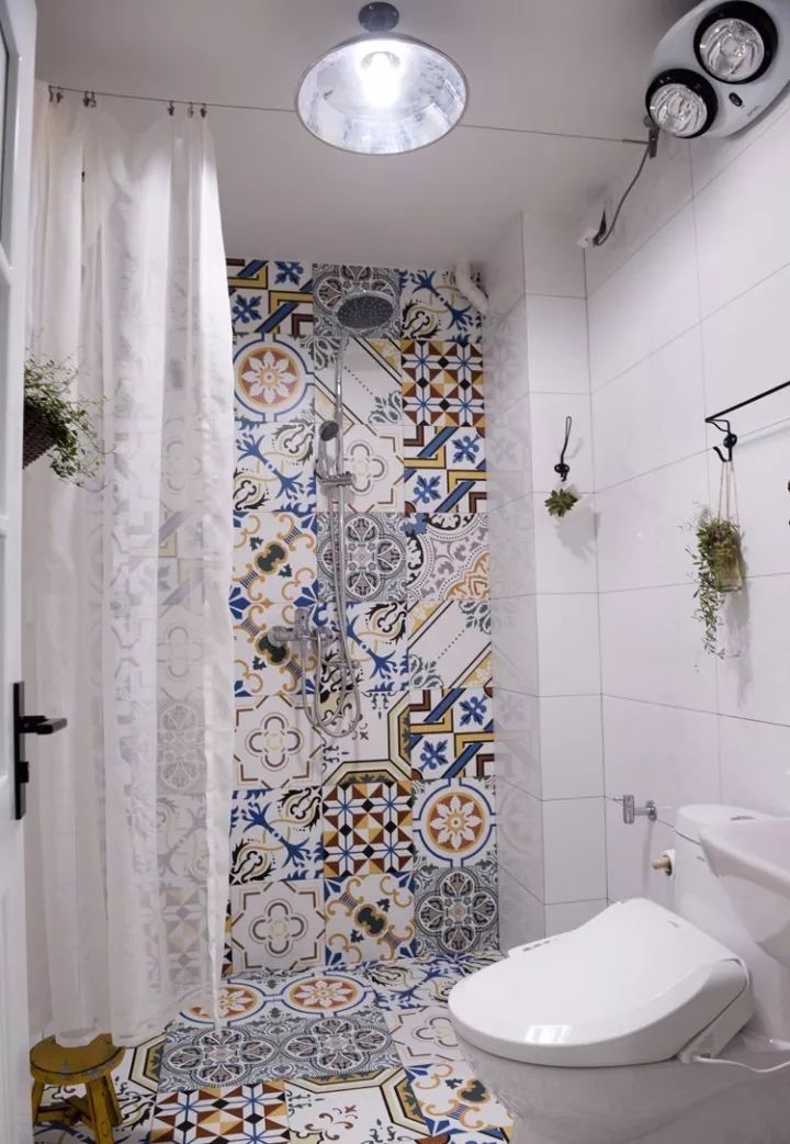 ▲淋浴区铺满了大花砖,让白色空间丰富有趣了不少,半透明的浴帘也创造了一种朦胧的美感。