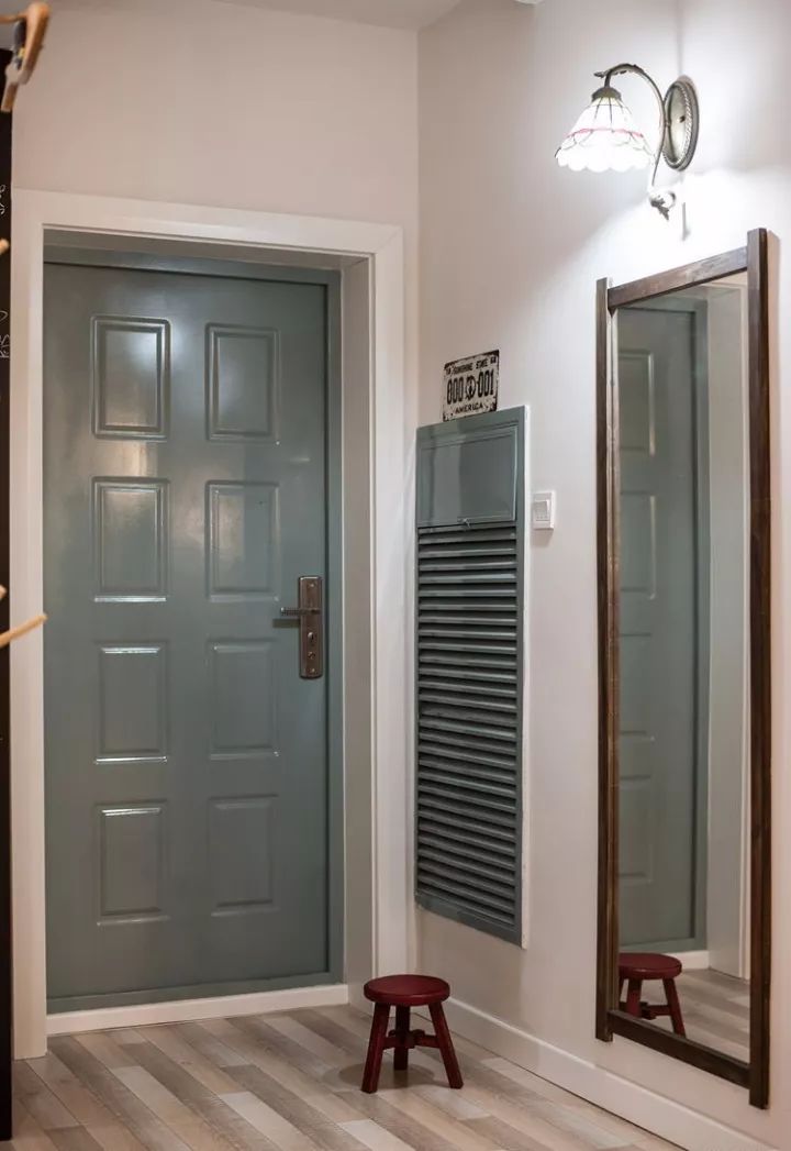 ▲玄关的设计比较简单,窄窄的门口搭配上小板凳和全身镜,做出最简约的鞋帽整理间,实用方便。