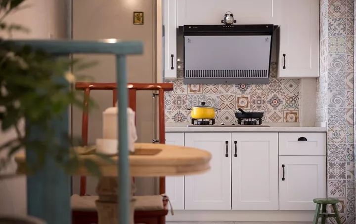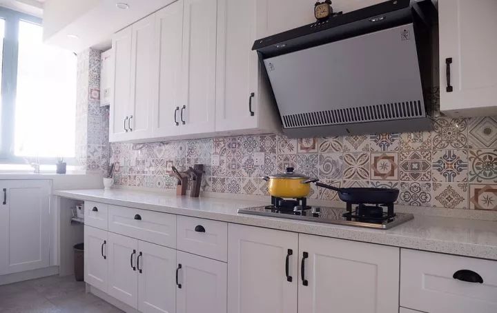 ▲厨房选用了白色的橱柜搭配上花色的瓷砖,简约的风格下增添了几丝复古感。