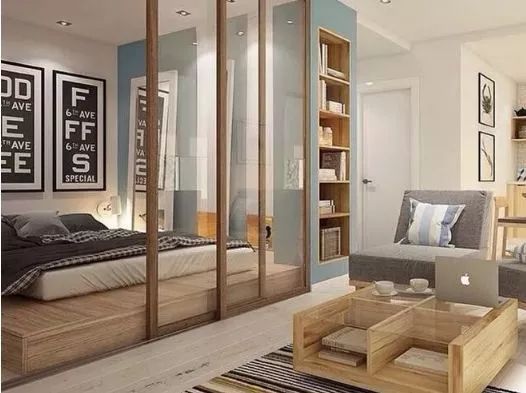 卧室还有用到移门的地方?肯定有,一般情况会两种,卧室面积不够大,常见的单身公寓以及小夫妻两人居住,受限于空间的影响,装修时又要做区域功能隔断,那选用移门也是很实用,图中的卧室就是用移门与客厅隔断,视野开阔不会有压抑感,既是独立又是互为一体,融入整个家装风里毫不突兀。▼