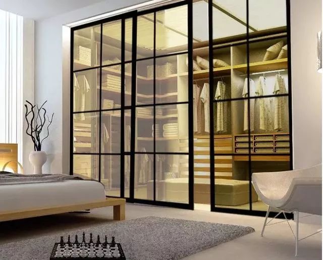 当然卧室移门不止小面积能用上,大面积的卧室,常见的会配置独立衣帽间,为了房间更加个性别致,可以将衣帽室的门设计为移门,同样会显得房间大气,再者很多衣帽间并没窗户,移门的设计便可以与卧室相通,再也不用担心衣帽间太封闭,空气不流通。▼