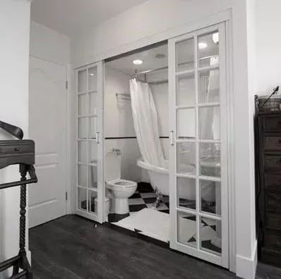 浴室也可以做移门?浴室是各个功能区域光线最差的,多数为没窗户及小窗户,光线不足,潮气重,通风差,如果门框适合装移门的话,这一问题也就解决了,下图所展示的为透明移门隔断,适合单身公寓。小夫妻及有家庭成员可以选择磨砂玻璃,但光线亮度与视野的感觉,就会略微缩减一些。▼